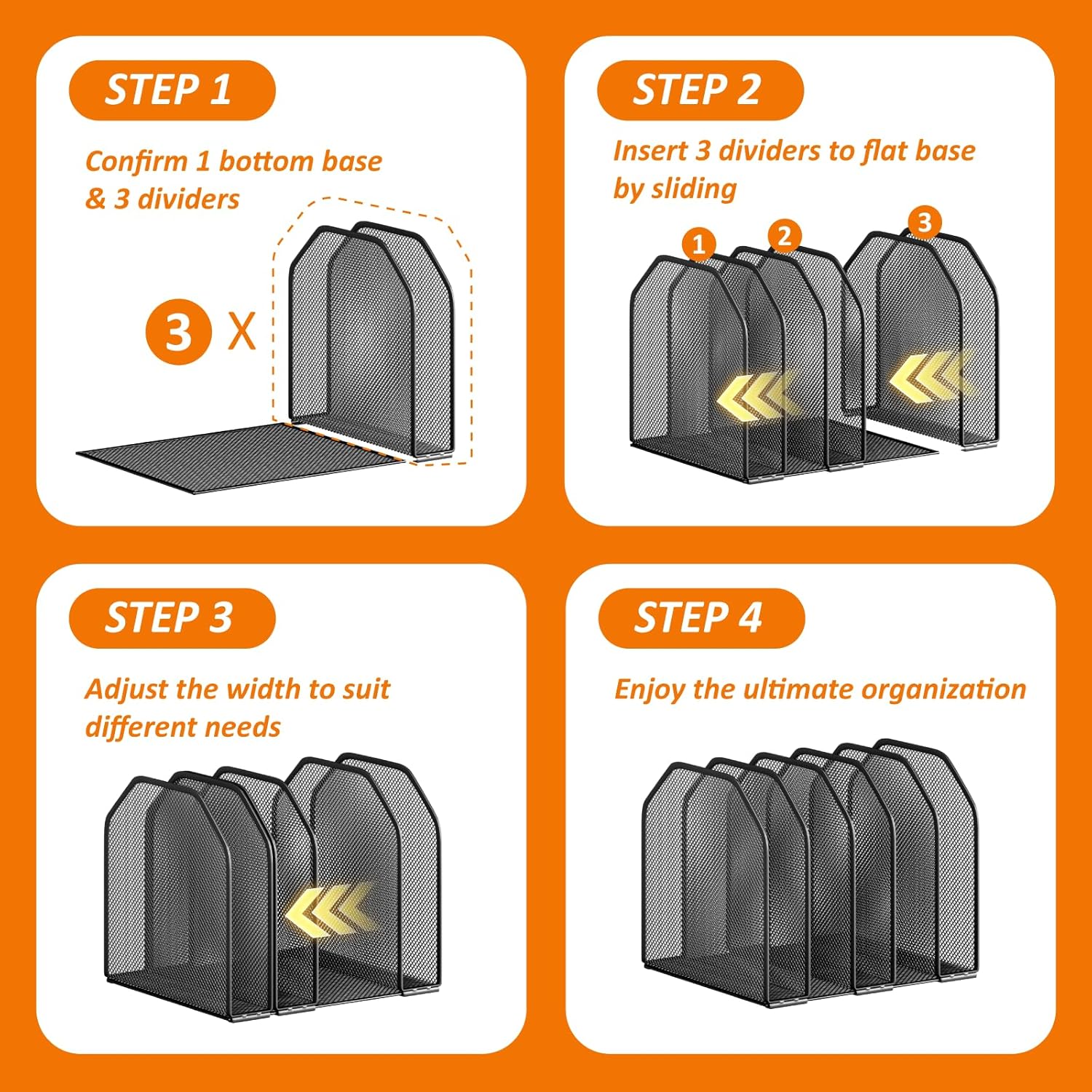 - Adjustable 5 Sections Desktop File Organizer: Featuring 5 sections and 3 adjustable freestanding dividers, The 3 divider sections attach by sliding bottom onto the flat base, you can adjust the width between the mesh dividers depending on what you want to put in each section to make it wider or more narrow. 3 movable frame allows you to freely adjust size to suit different needs, it adapts to fit store files, books, laptops, and more, keeping everything within reach for ultimate convenience.