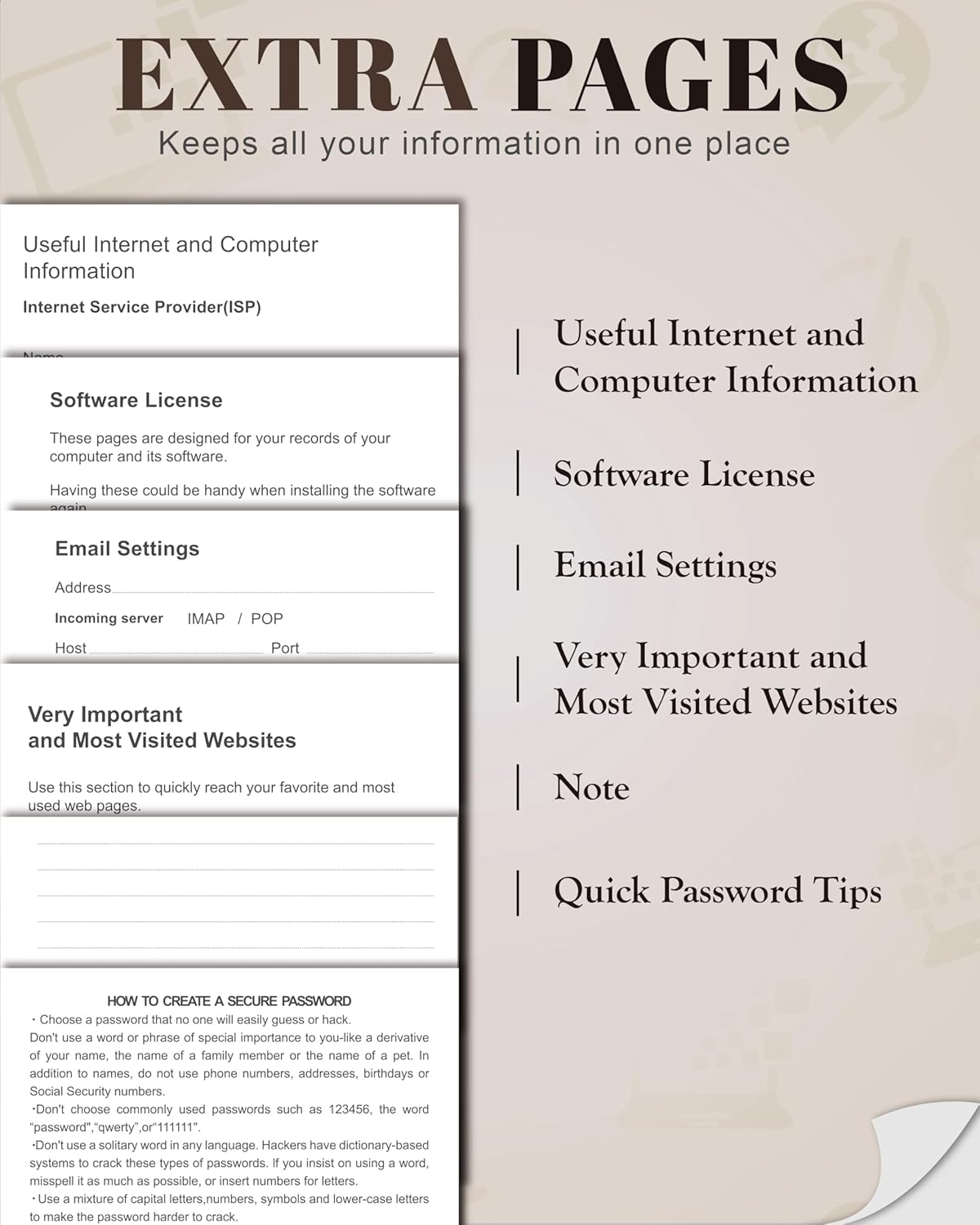 - Easily Store Up to 675 Passwords: This password notebook, which has 230 pages with 100gsm thick paper, boasts the capacity to store up to 675 passwords, almost twice as much as similar products on the market. Our password journal also provides ample room for internet service providers, wireless router settings, software licenses, email settings, frequently visited websites, and additional notes.