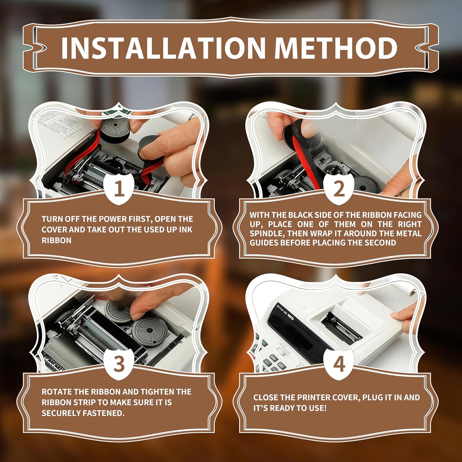 - SIZE SPECIFICATIONS: The kit includes 4 packs of Sharp printer ribbons, each approximately 16 feet long, with a spool diameter of 1.37 inches and a width of 0.5 inches, and each pack is individually wrapped to ensure a longer life for the ink!