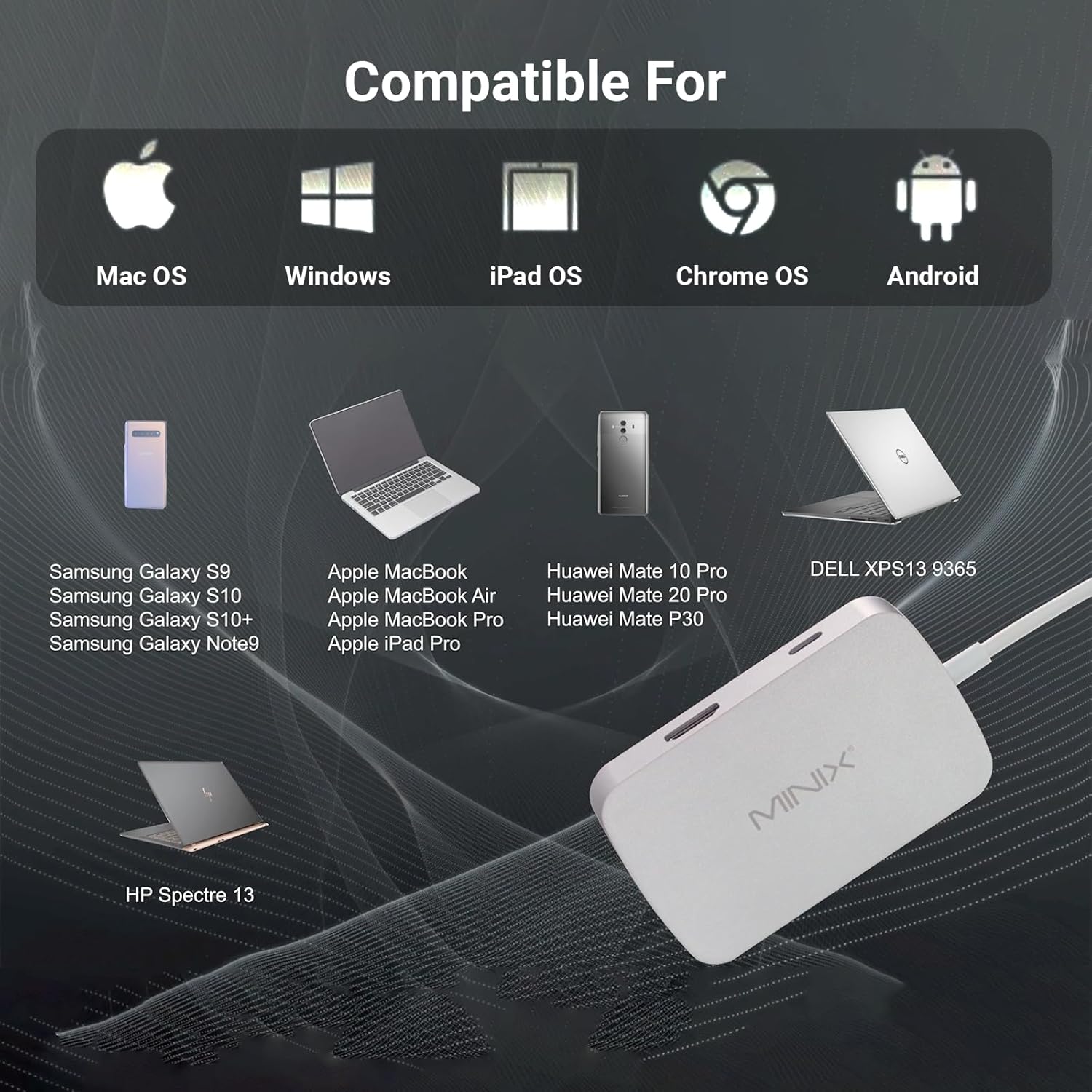 - Universal Compatibility: MINIX macbook hdmi adapter Supports MacBook Pro/Air Ipad, usb hub for laptop and More. Please note, it is important to verify your device supports display output, power input and data transfer via USB-C to ensure compatibility with the adapter.