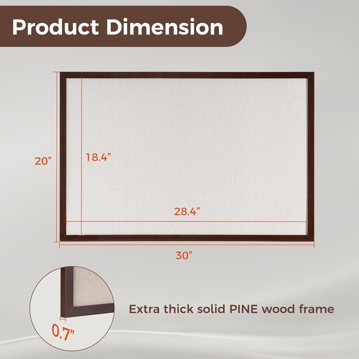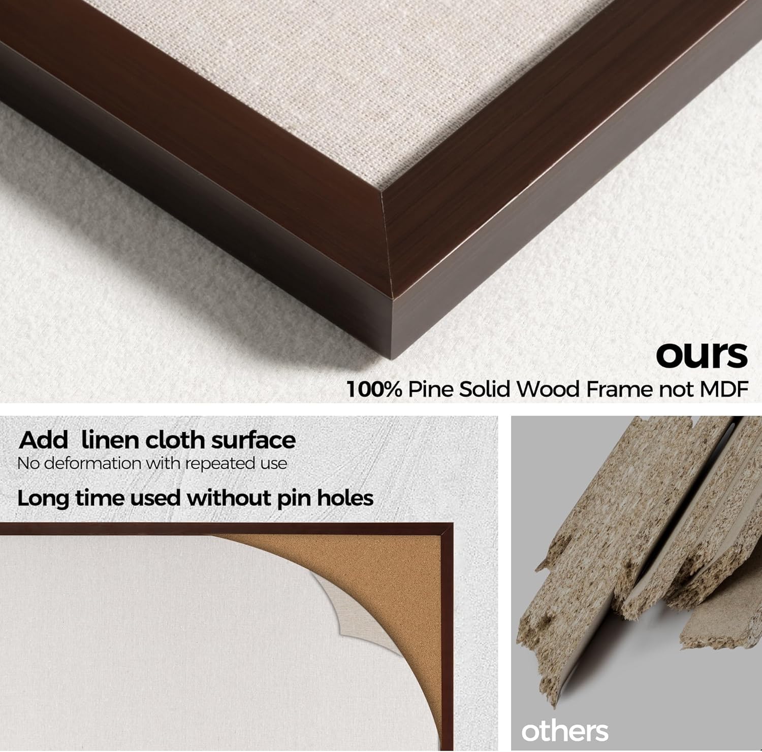 - Pine Frame Material: Our cork boards for walls is made of 100% pine wood which has well self-healing ability and repairability. The pin board features a four-ply splint design that is strong and thick enough not to be punctured by thumbtacks.