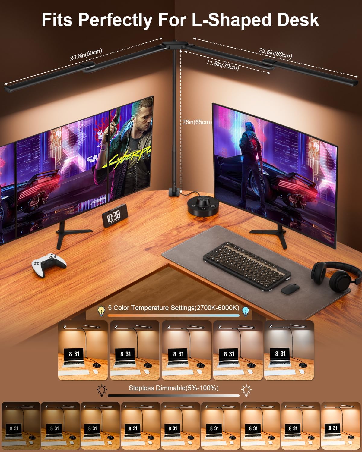 - 【360° Adjustable Gooseneck for Versatility】 The long flexible gooseneck provides 360° adjustment, letting you position the light exactly where needed. Its 46-inch extra-wide arm is perfect for large monitors or multi-screen setups, and it fits various desk styles such as L-shaped, standing desks, or bedside tables. The sturdy metal clamp with silicone padding ensures compatibility with desks up to 2.5 inches thick, providing stability and protection.
