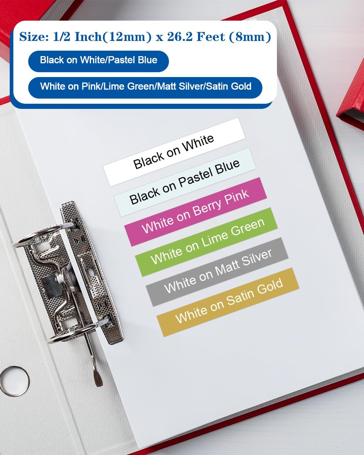 - Color:Black Ink on White/Pastel Blue Tape, White Ink on Pink/Lime Green/Matt Silver/Satin Gold Tape, total 6 packs p touch label tapes