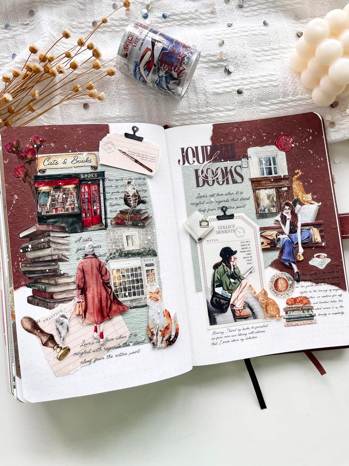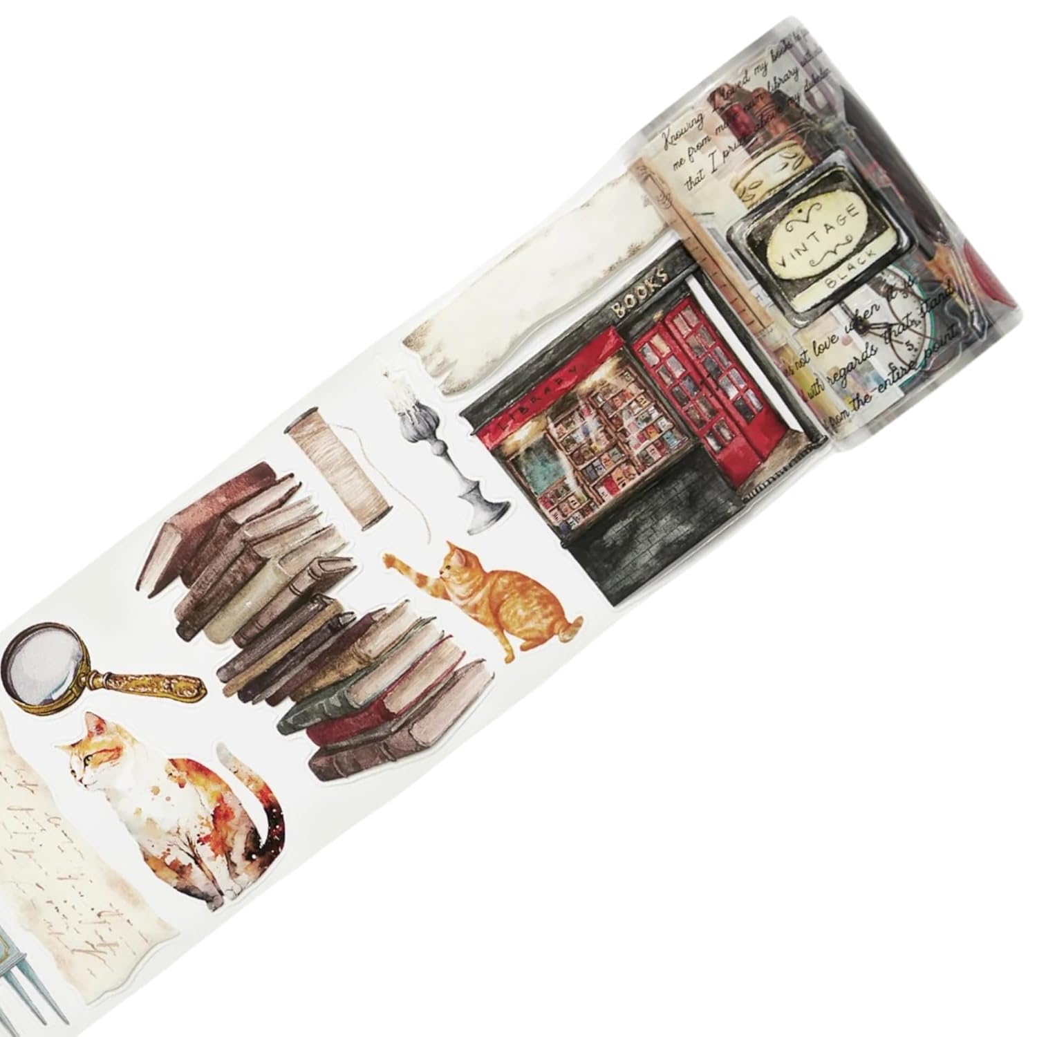 - Step into a world of old libraries, where curious cats roam among dusty shelves and vintage books. This tape brings an elegant, nostalgic touch to your journaling and crafting, featuring beautifully detailed designs of cats lounging in an antique library setting. Whether you’re creating dreamy layouts or wrapping a special gift, this washi and PET tape adds a timeless charm to all your projects. With pre-cut designs, it’s as easy as peel, stick, and enjoy!