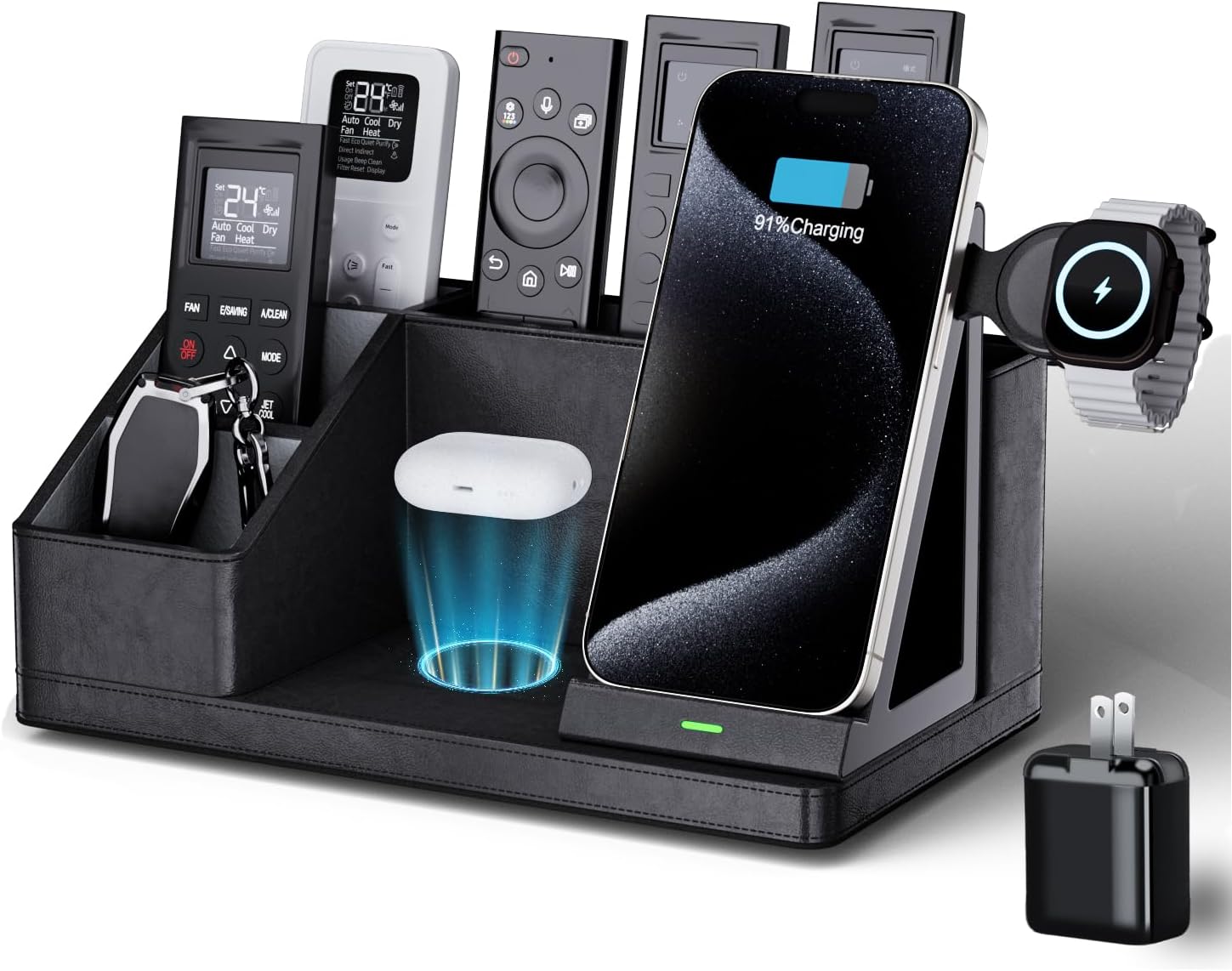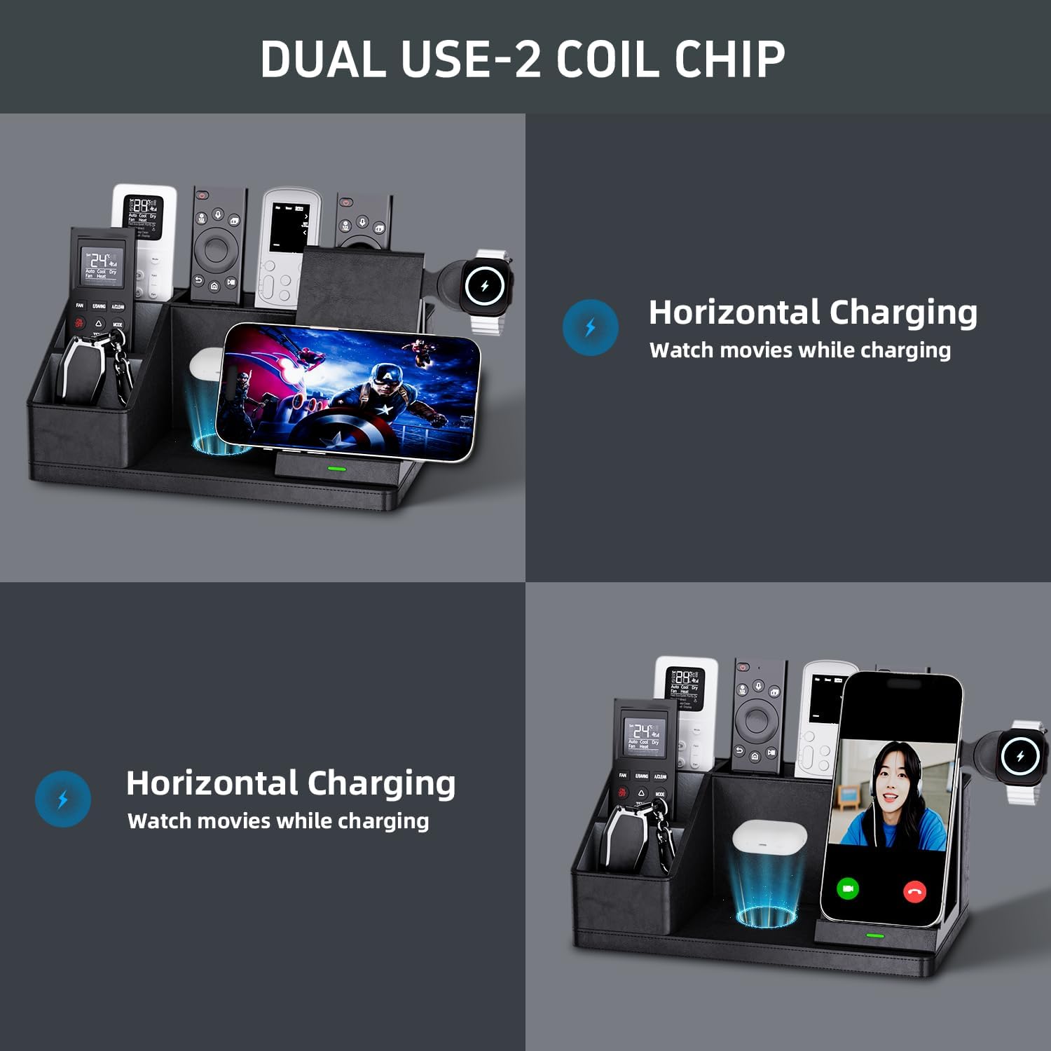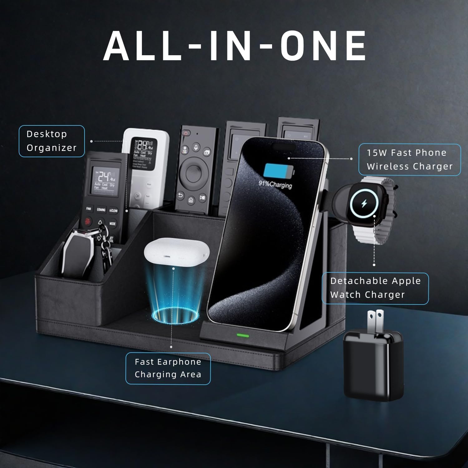 - 4-in-1 Multifunctional Desk Organizer: Keep your workspace tidy with this all-in-one desk organizer. Designed with a wireless charging station, it offers fast charging for your Qi-enabled phone, AirPods, and Apple Watch while also providing ample storage space for office supplies, pens, keys, and other small essentials. Declutter your desk and stay organized effortlessly!