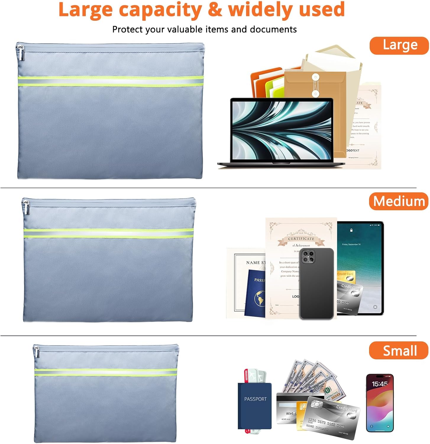 - Three Versatile Sizes: This set includes three fireproof and water- proof pouches—15" x 11", 13" x 9.7", and 10.5" x 8"—designed to store and protect all your valuable items. Ideal for important documents, cash, bank deposits, passports, credit cards, jewelry, keys, certificates, photos, and more.