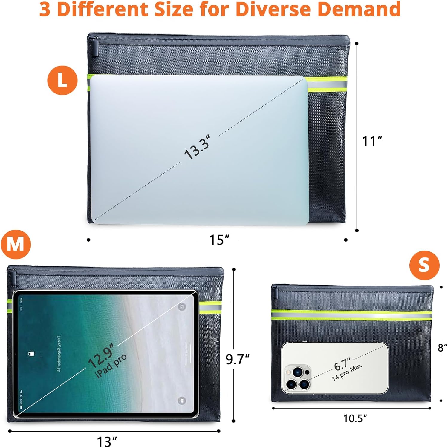 - Three Versatile Sizes: This set includes three fireproof and water- proof pouches—15" x 11", 13" x 9.7", and 10.5" x 8"—designed to store and protect all your valuable items. Ideal for important documents, cash, bank deposits, passports, credit cards, jewelry, keys, certificates, photos, and more.