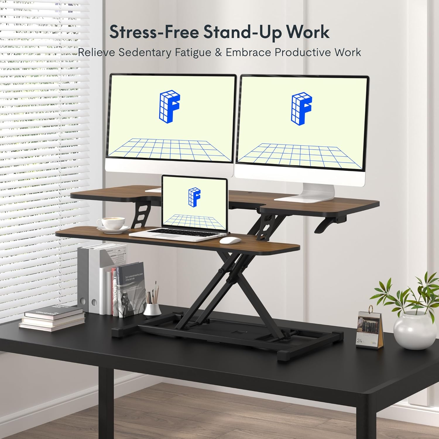 FLXISPOT 42" Standing Desk Converter Sit to Stand up Riser Height Adjustable Monitor and Laptop Workstation with Spacious 2-Tier Desktop, Walnut Color