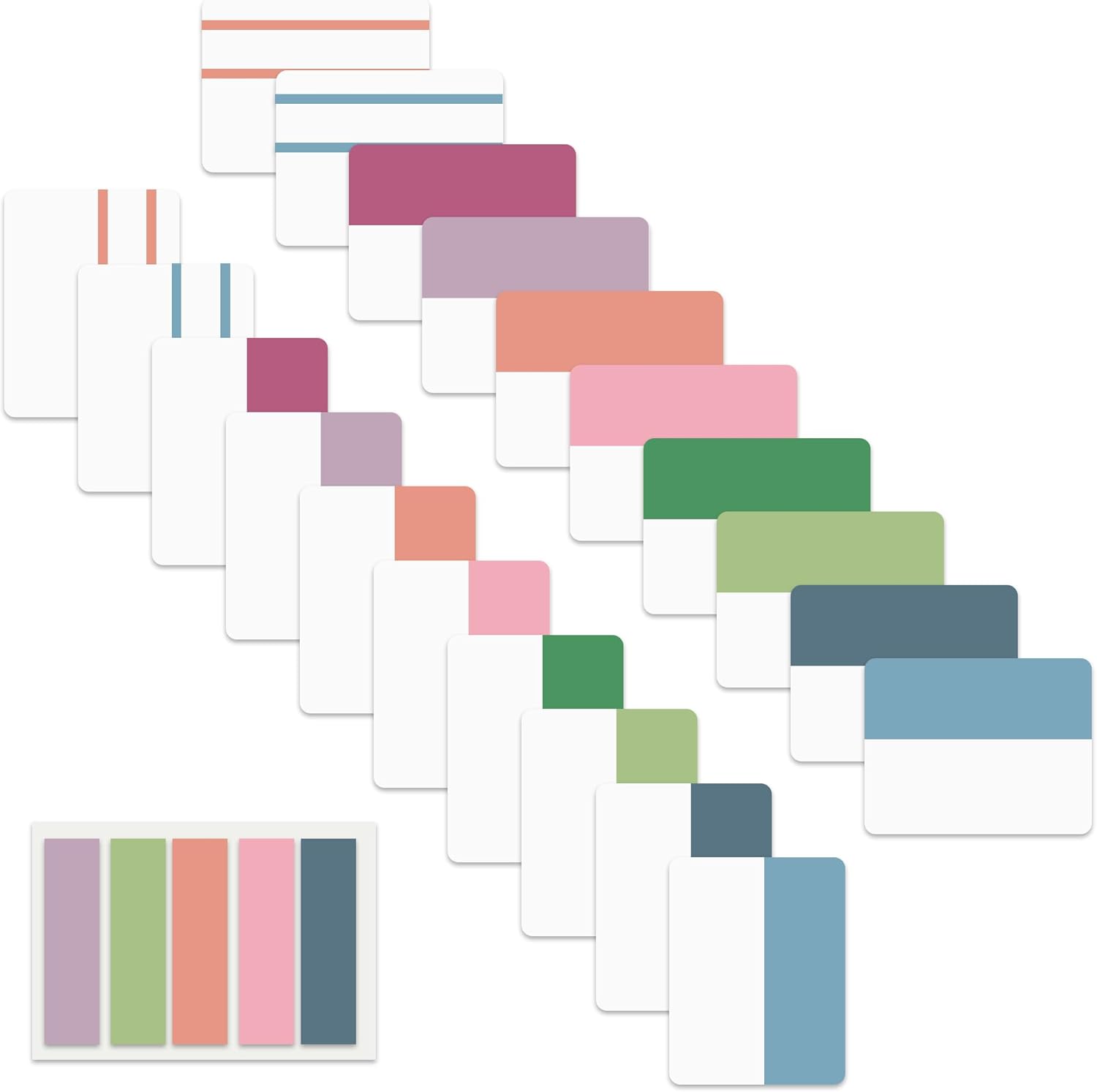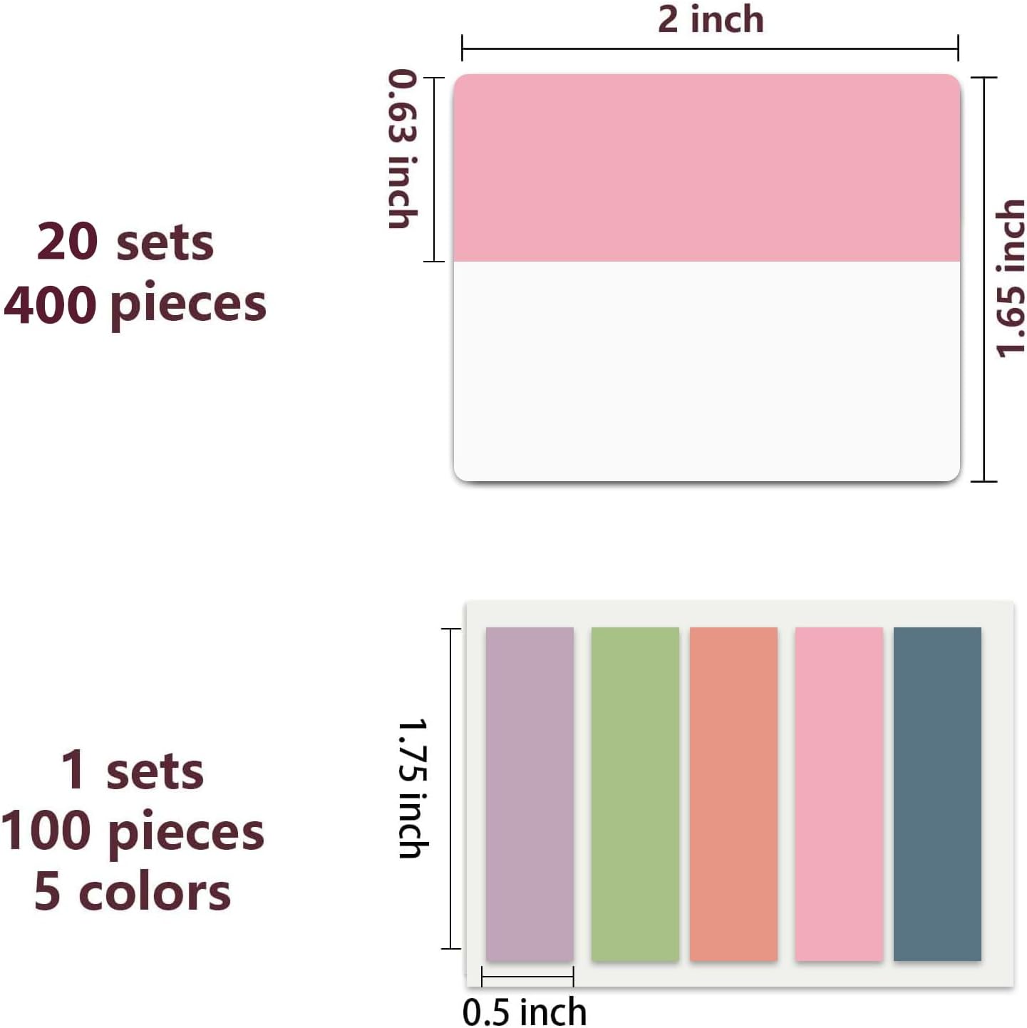- Sticky Tabs: 500 pieces 21 sets in total, 400 pieces 2 inch sticky tabs in 20 sets with different pastle colors,100 pieces 0.5 in tabs in 1sets, 20 pieces each color
