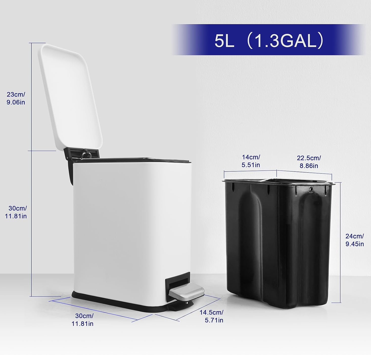 Bathroom Trash Can with Lid,5 Liter / 1.3 Gallon Small Trash Can with Removable Liner Bucket, Soft Close lid & Step Pedal, Stainless Steel Trash Bin for Bathroom,Bedroom,Home Office, White
