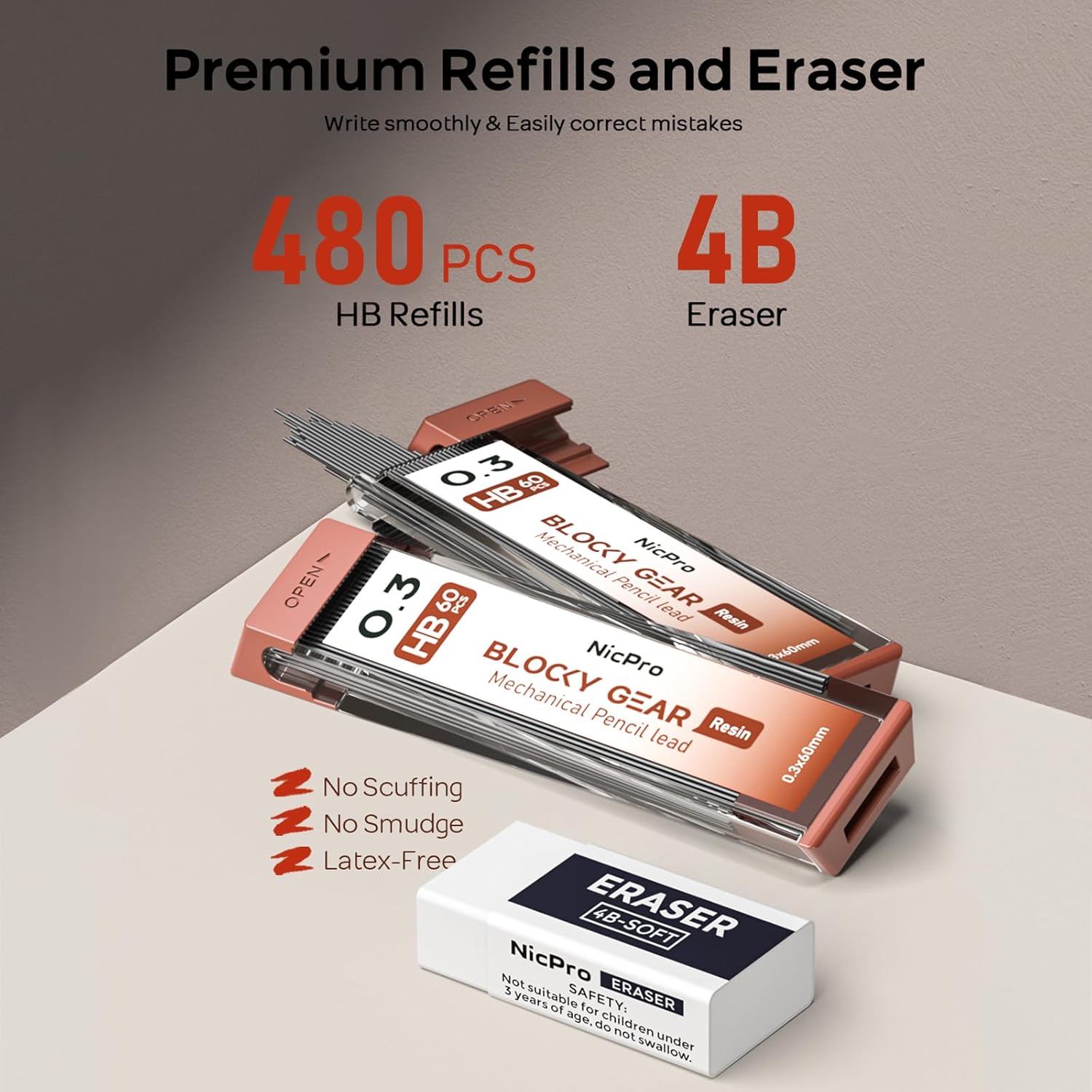 - Nicpro Blocky Gear:Come with 3PCS metal 0.3mm mechanical pencil and 8 tube of 0.3 mm lead refills (6 tube of HB and 2 tube of 2B), 60pcs / tube, 3pcs 4B latex-free eraser, 18pcs replaceable cap erasers,1 pcs kneaded eraser, all the stuff storage neatly in a case with flocking tray,what a gift for friends & family!Ideals for artists, professionals, teachers and students alike