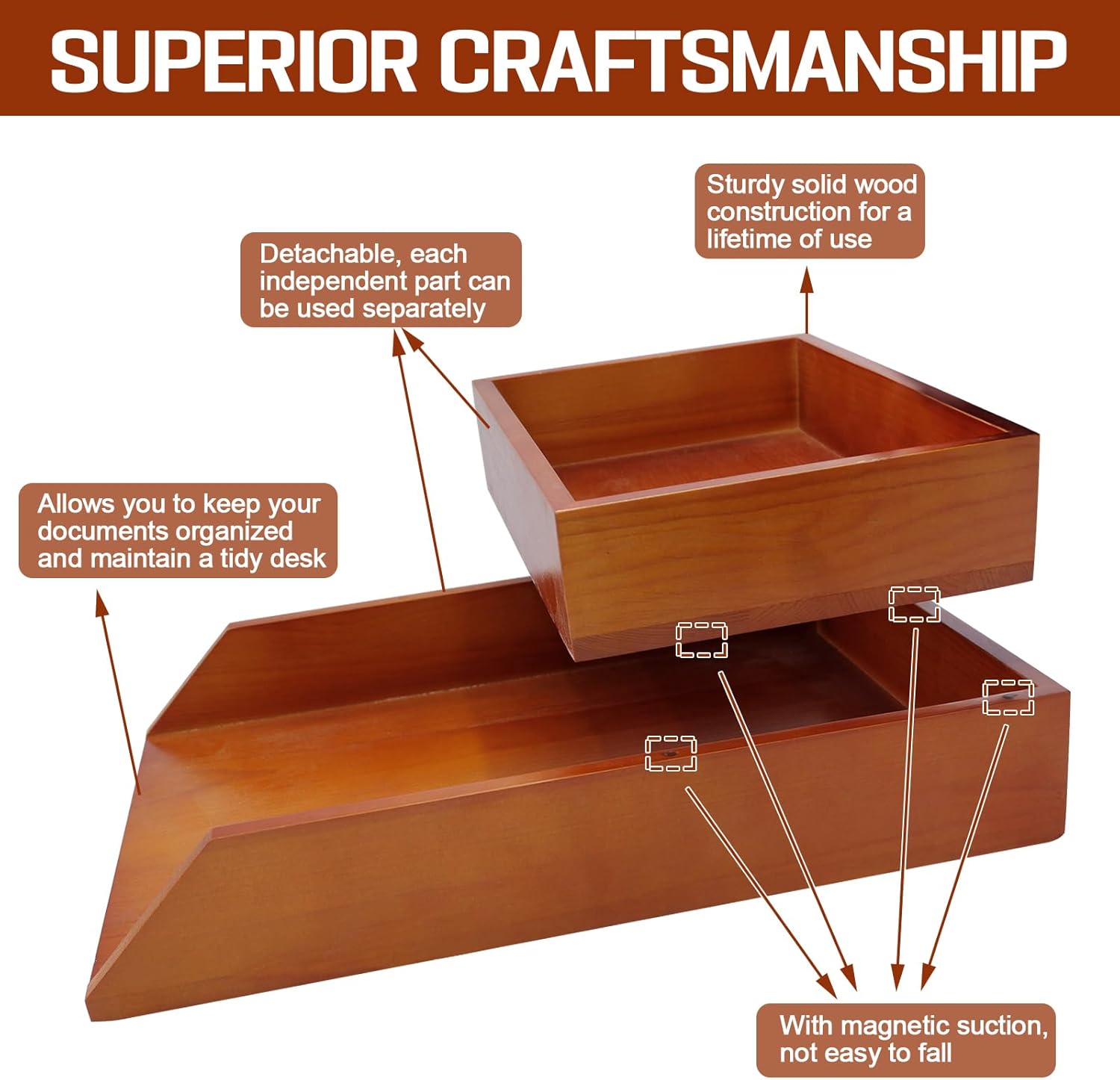 Desk Organizer Letter Tray Set of 2, Magnetic Wooden Tabletop Desktop for Storage Paper Letter Folders Notebooks Copy Print, Workspace Holder, Office Supplies, Keep Stationery Saver-Brown
