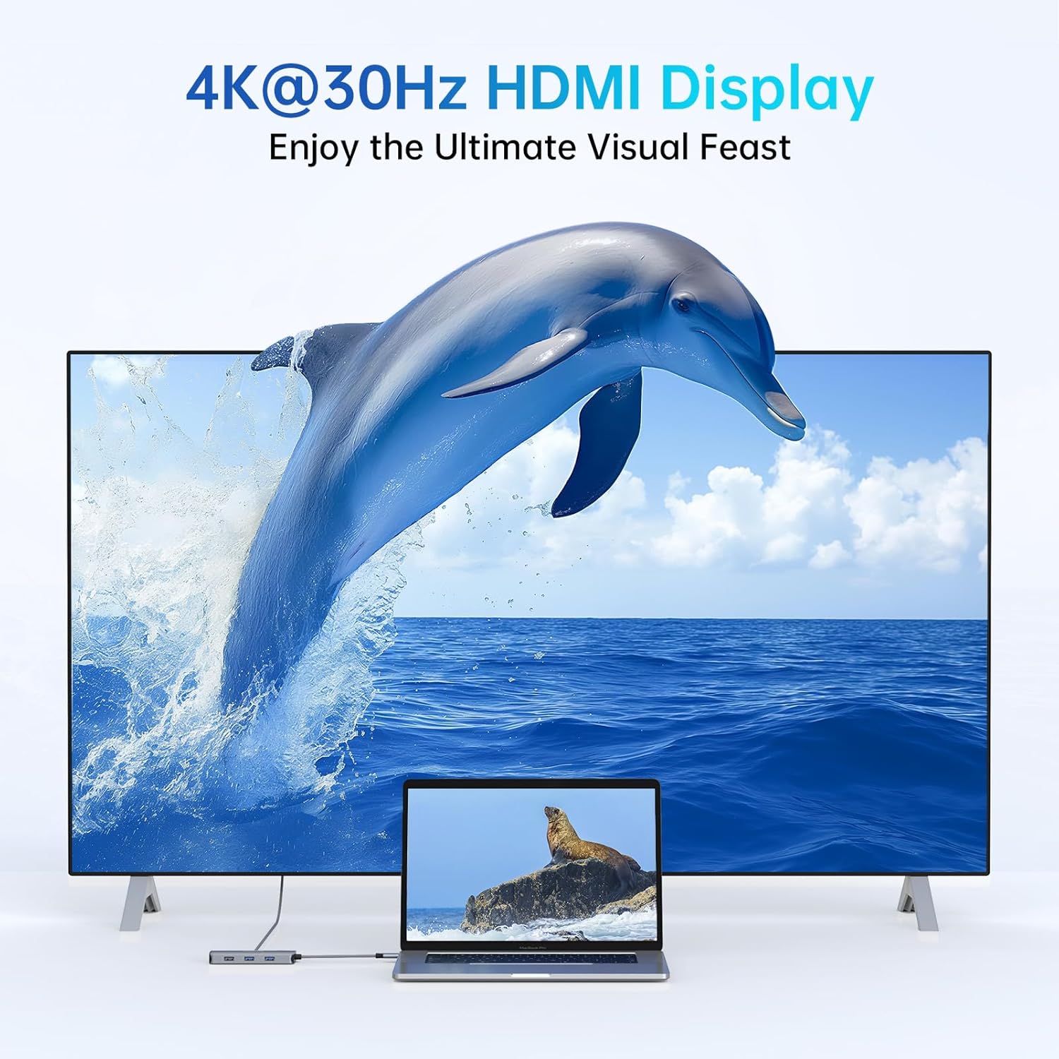 - USB-C Hub: macbook pro adapter with HDMI make it possible for you to connect to a display screen or TV for 4K video output.With three USB Port, you can charge devices, connect external hard drive. There is also a 1000Mbps Gigabit RJ45 ethernet port, TF and micro SD card readers, and two USB-C female PD Charging port.All hub ports can work simultaneously, small yet mighty.