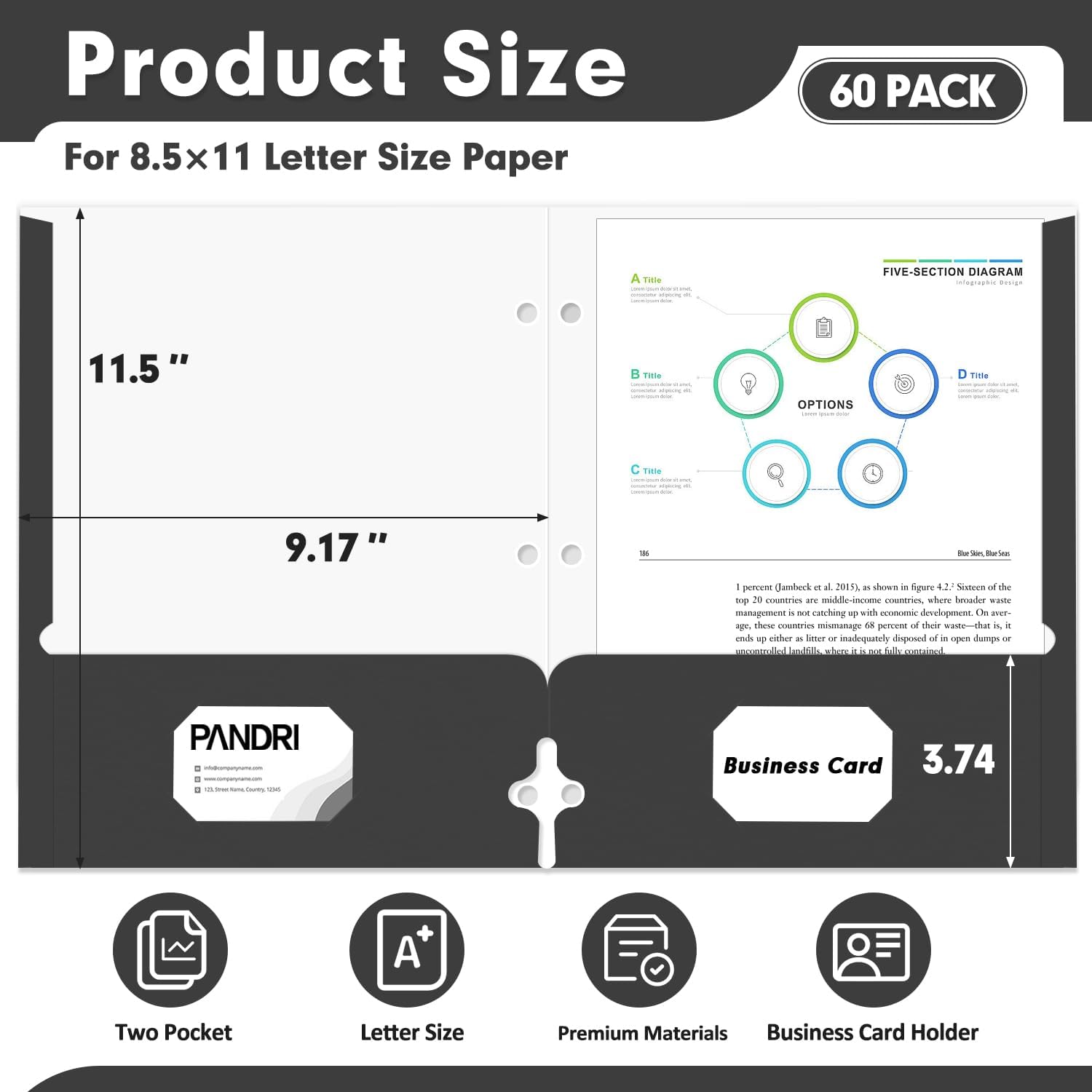 Two Pocket Portfolio Folders, PANDRI 60 Pack 3 Hole Punched 2 Pocket Folders for 3 Ring Binder, Letter Size Paper File Folder for School Office Home Business, Black