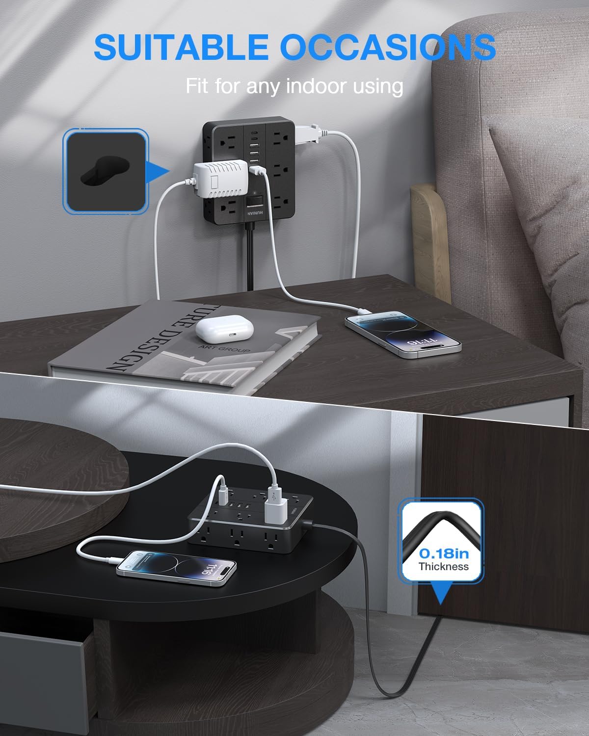 - 18 in 1 Power Strip with USB: This flat plug power strip could turn 1 socket into 12 AC outlets and 6 USB ports, 1.65 inchces widely spaced in between outlets, fit big adapters without blocking each other, keep your desktop organized; You can use it in any indoor place such as home, office and dorm room