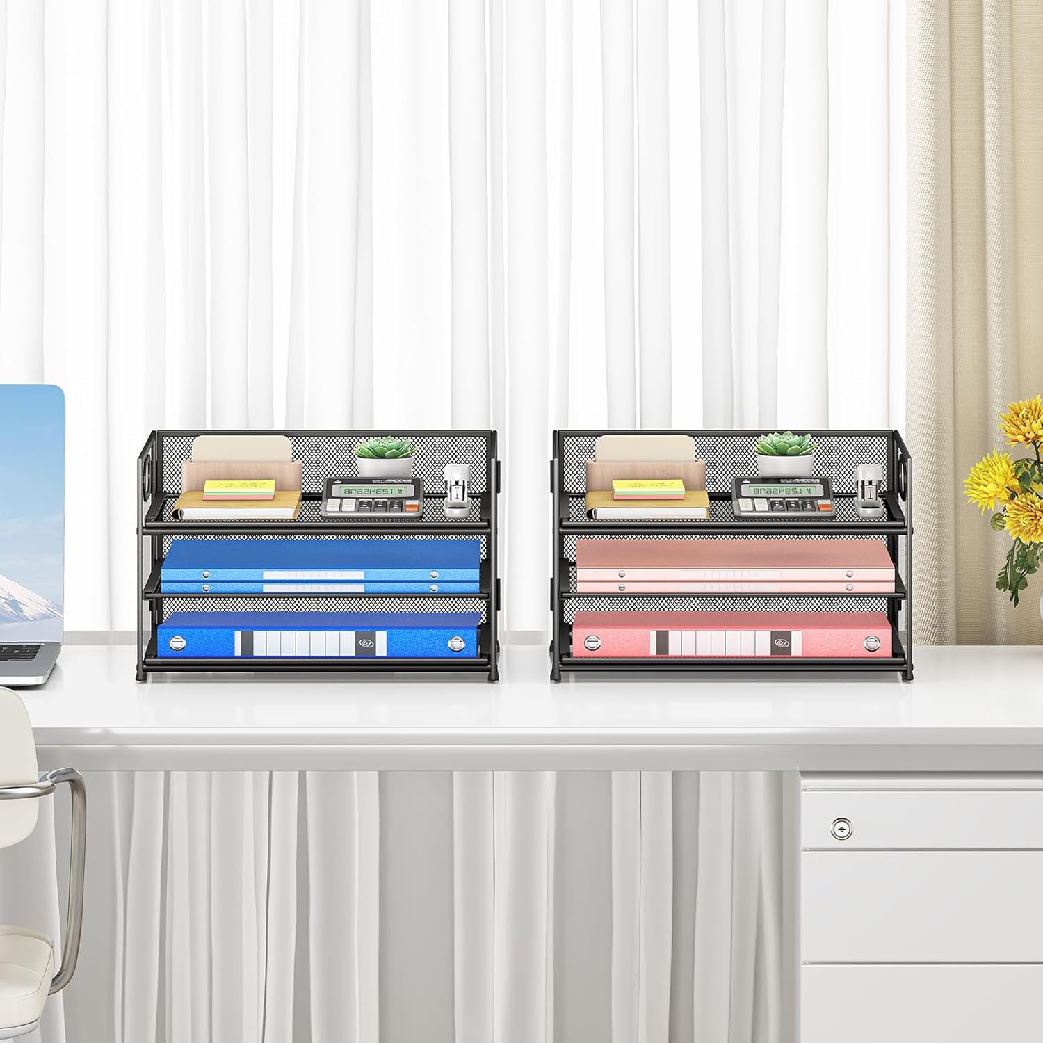 Subekyu 2-Pack 3-Tier Paper Letter Tray Organizer for Desk, Black Metal Mesh File Sorter Organizer with Handle and 1 PC Sliding Tray for Home Office School Desk Supplies Organization Storage