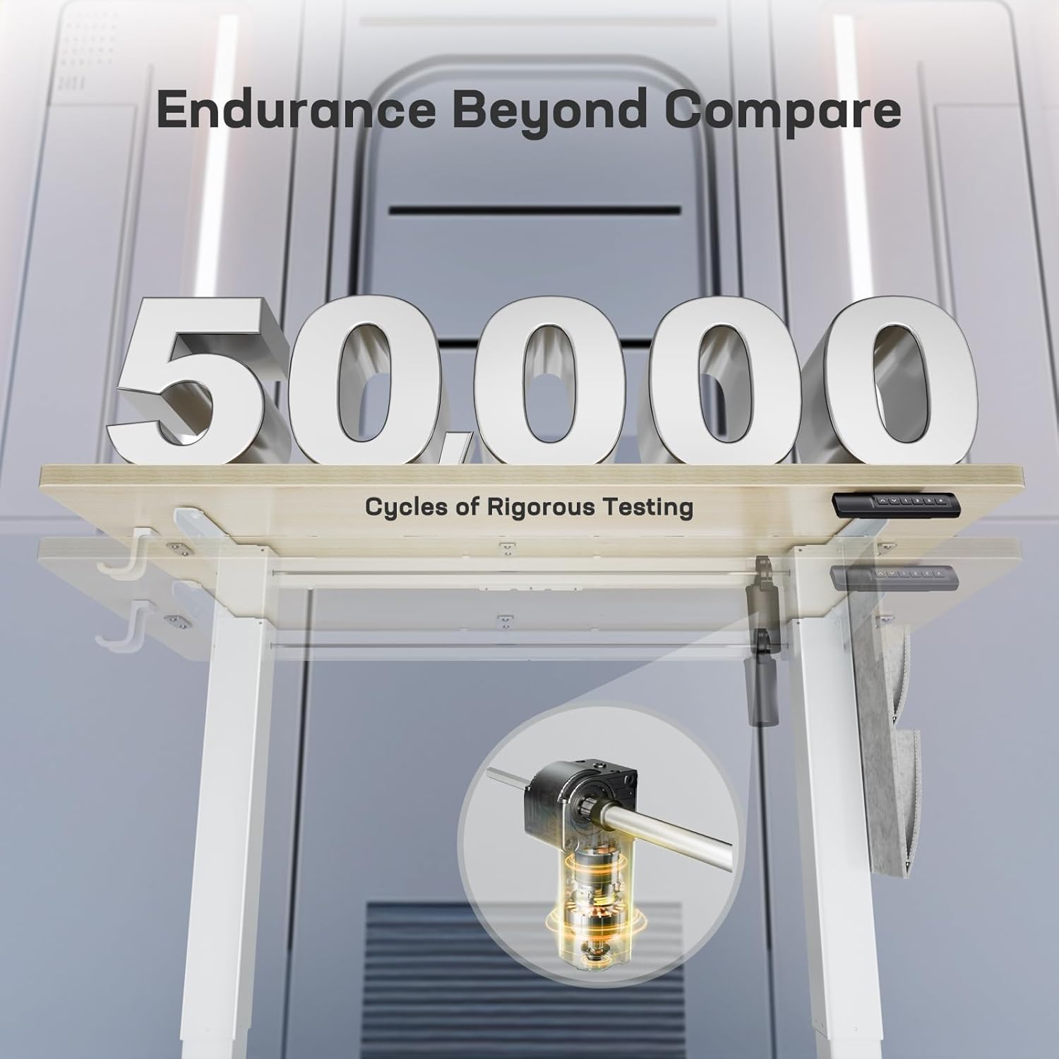 - Energy-Efficient Motor: Powered by a quiet motor operating at less than 50 dB, the desk moves smoothly at 3 inch per second even at maximum load. Its solid steel frame ensures stability, providing a reliable foundation. The energy-efficient motor consumes less power, making it eco-friendly. Designed for daily use, the motor supports a dynamic work environment, transitioning seamlessly between tasks. The frame enhances durability, remaining stable regardless of load or adjustments.
