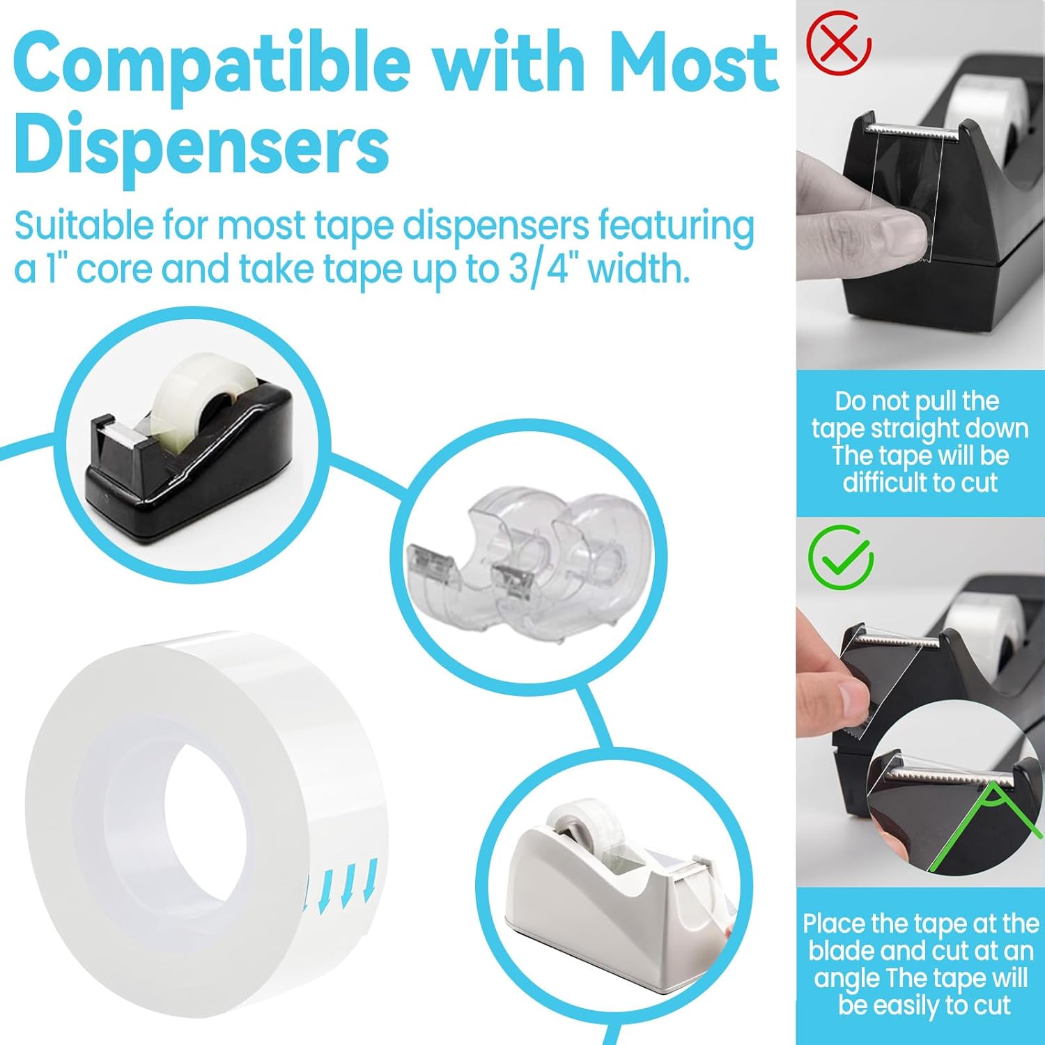- Compatible with Most Tape Dispensers – Smoothly fits most tape dispensers with a 1" core and accommodates tape up to 3/4" width