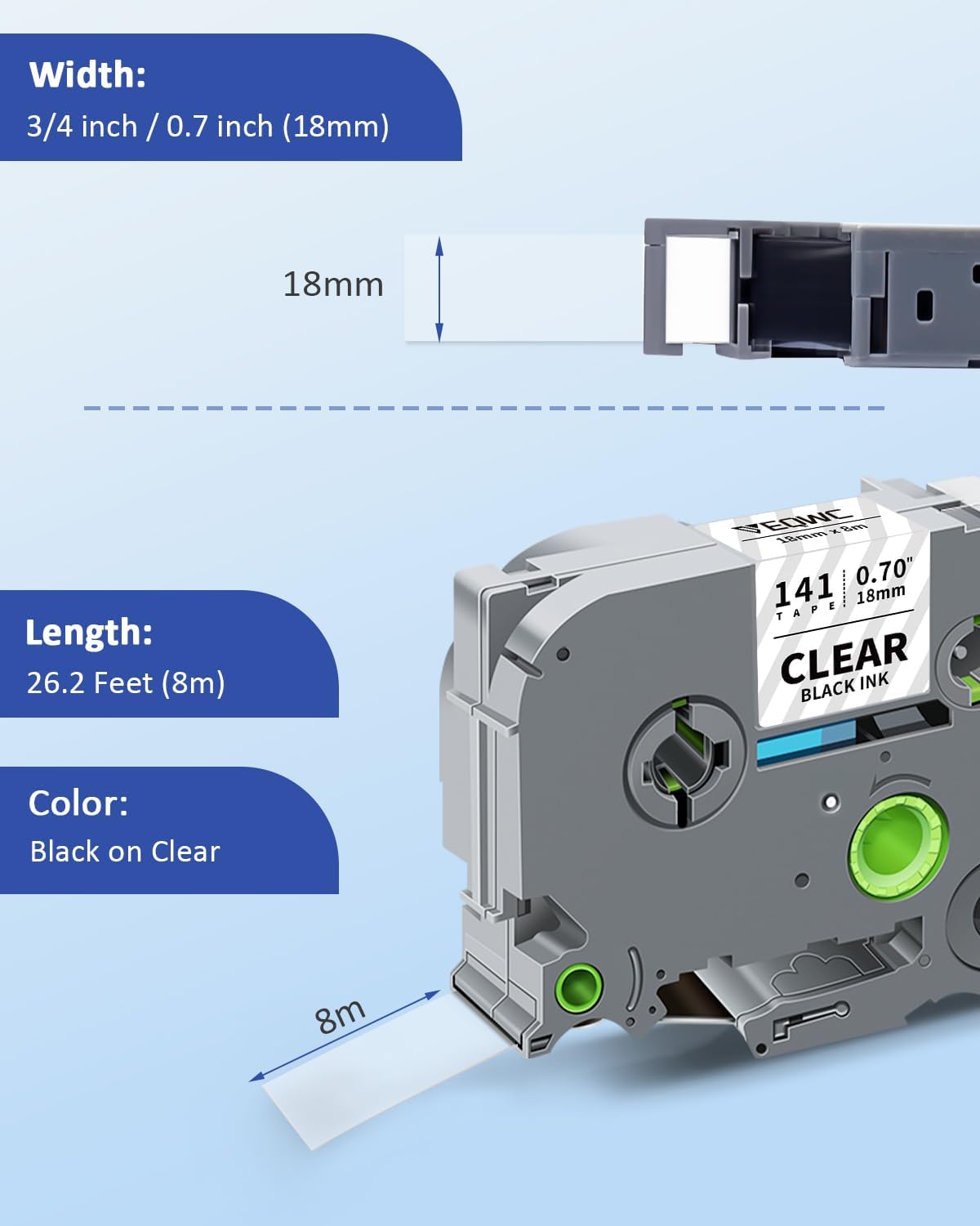 TZe-141 18mm 0.7 Laminated Clear Tape Compatible for Brother TZe141 Tz-141 P Touch 3/4" TZe TZ Tape for Brother Ptouch PT-D610BT PT-D400 PT-D600 PT-D410 PT-D460BT Label Maker, Black on Clear, 4-Pack