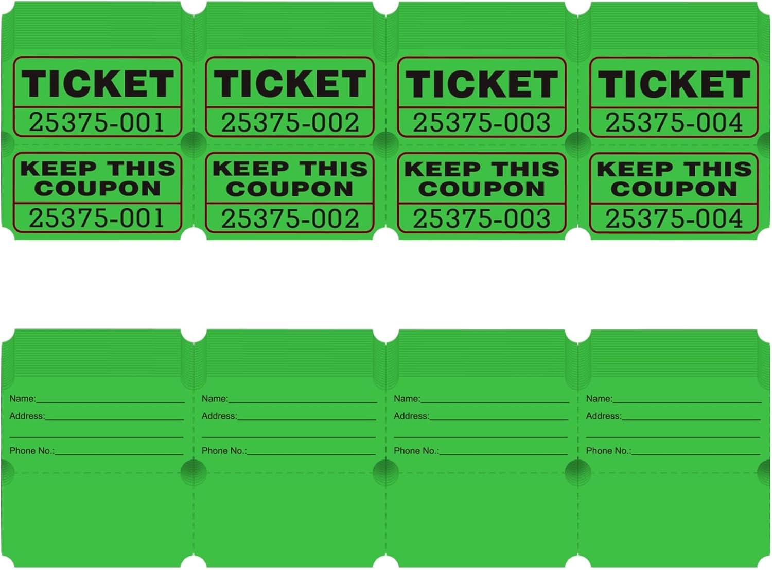 - The Green colored raffle tickets are consecutively numbered and perforated, making it easy to tear off multiple tickets at once. The large numbers are easy to read and there are duplicate numbers for tracking purposes.