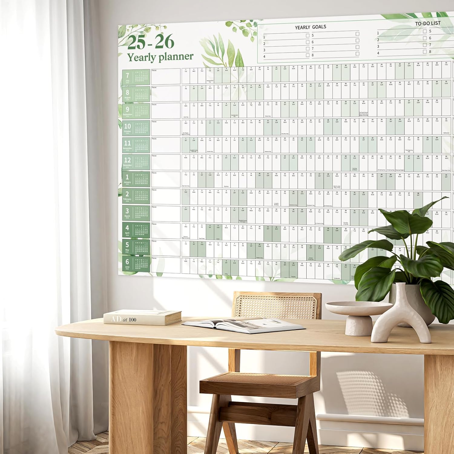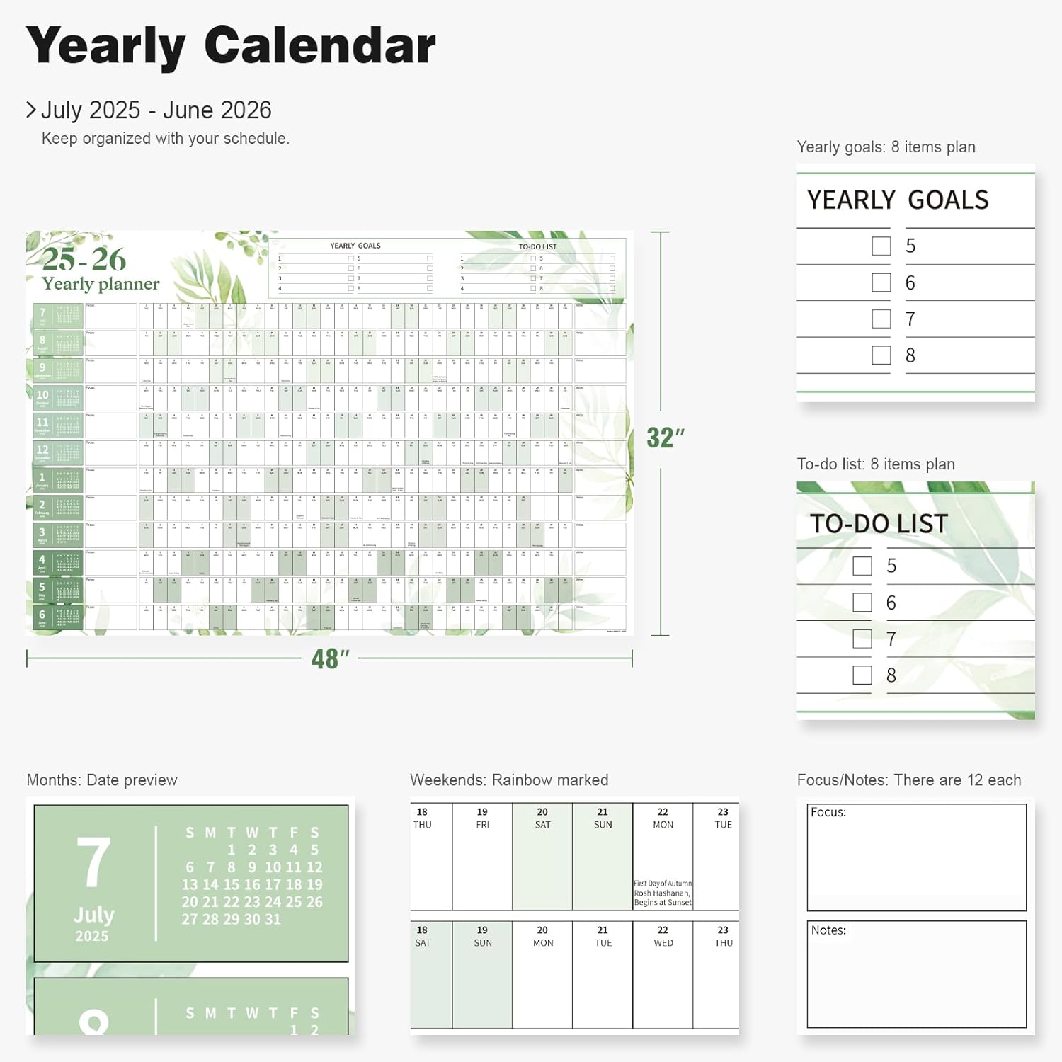 Ospelelf Large Wall Calendar 2025-2026 - 32'' x 48'' Dry Erase Calendar for Wall, 12 Month Laminated Calendar for Classroom, Family, Use July 2025 - June 2026 (Leaf)
