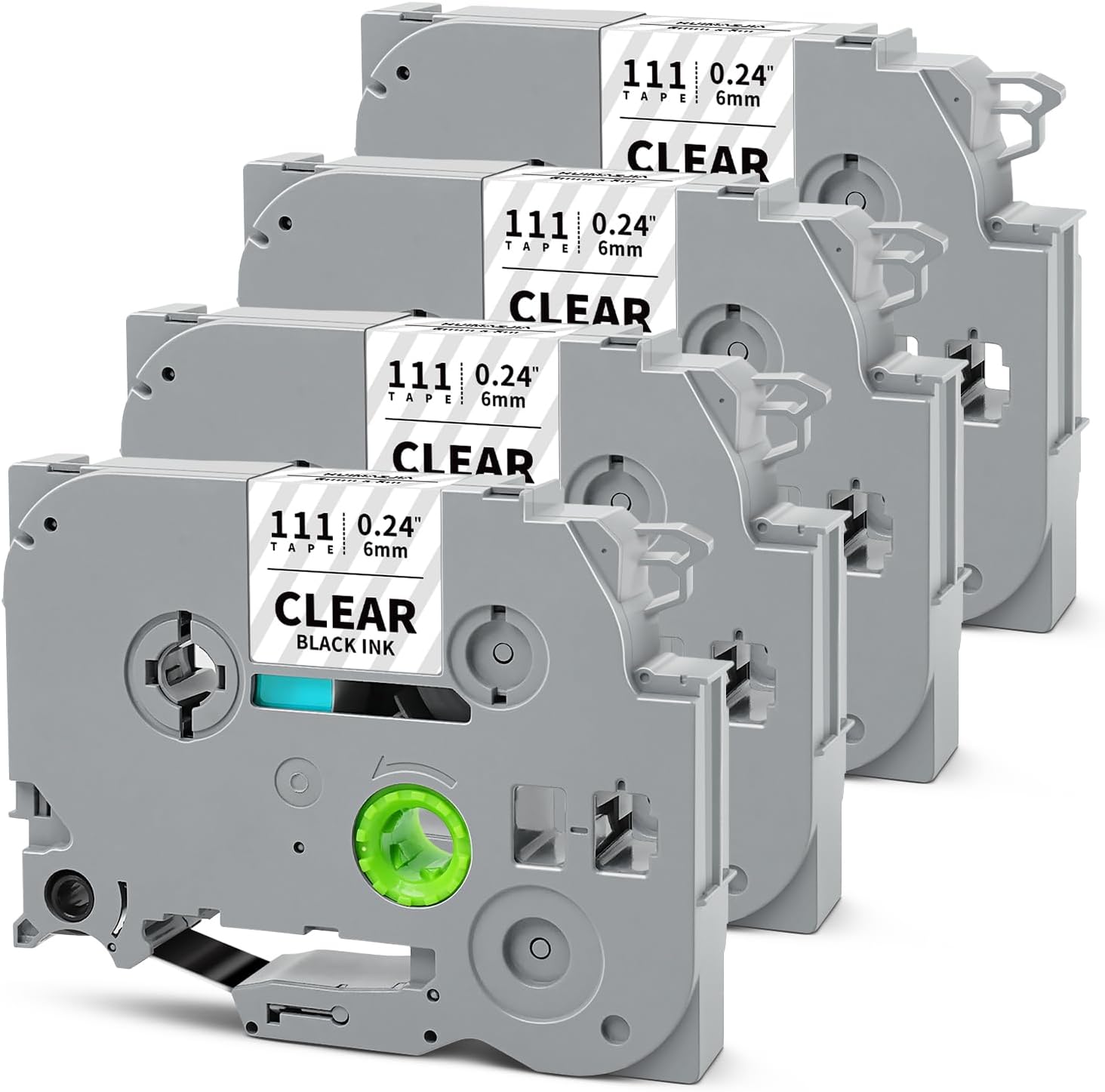 Tze111 6mm 0.23" Laminated Clear Tape Compatible for Brother 6mm Label Tape Tze-111 Tz-111 P Touch Tz Tze 6mm 1/4" Black on Clear Label for PTH110 PTD210 PT-D220 PTD400 PT-D610BT, 4-Pack