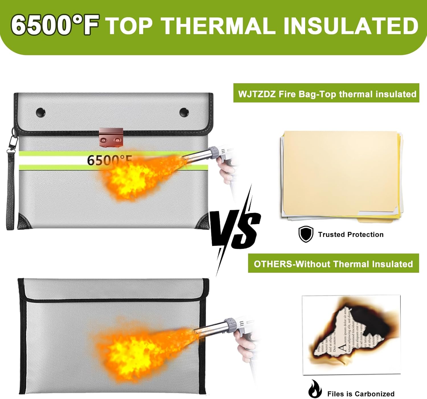 - ⚠️(Note) Fireproof does not mean it can withstand a long fire, and waterproof does not mean it can be immersed in water for a long time.It just gives you enough time to rescue your valuables. 🔥【6500°F Top Fireproof】The upgraded fireproof bag has passed the global flammability standard (US laboratory) and vertical burning test (SGS UL94 V-1) and can withstand temperatures up to 6500°F, far exceeding the typical fire temperature.