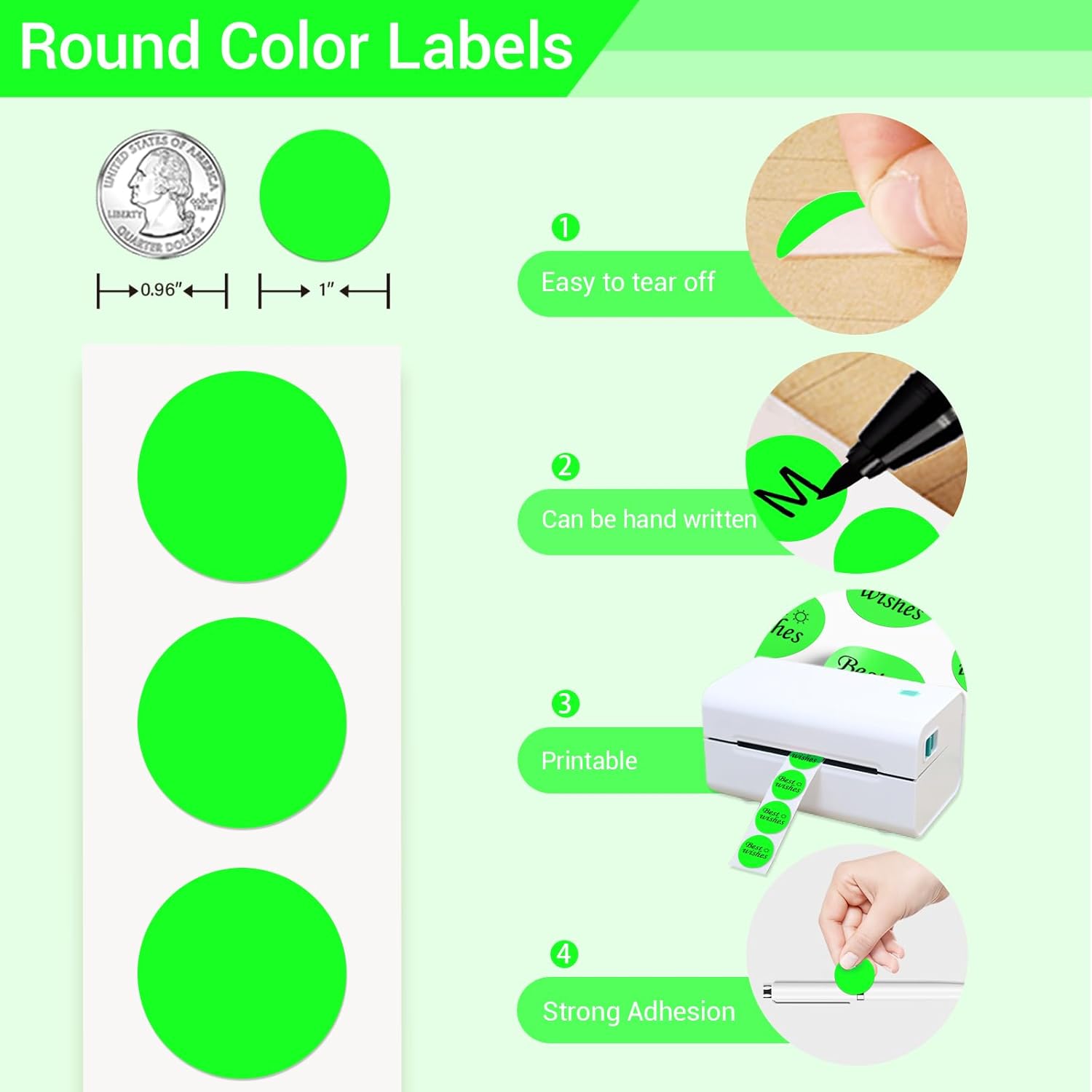 - What You Will Get: Each roll contains 1000 pieces of 1 inch round thermal labels. These color-coding sticker dots are easy to peel off and apply to various surfaces. Fluorescent green color round stickers are suitable for home sorting, office organization, business displays, etc