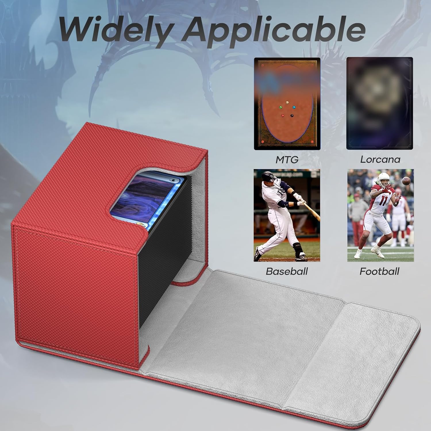 - 【Versatile Card Storage】Designed with card gamers in mind, this card deck box is compatible with a wide variety of trading cards. The deck box tcg works with MTG, PKM, TCG, helping you keep your collection organized and enhancing your gaming experience.