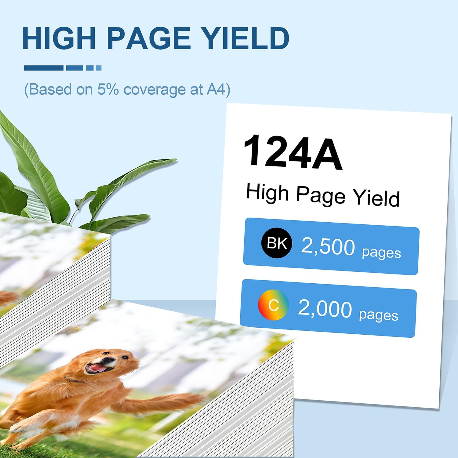 - Expected Page Yield: 2,500 Pages for 124A Black Toner Cartridge, 2,000 Pages for 124A Cyan/Yellow/Magenta Toner Cartridge (Letter/A4, at 5% Coverage)