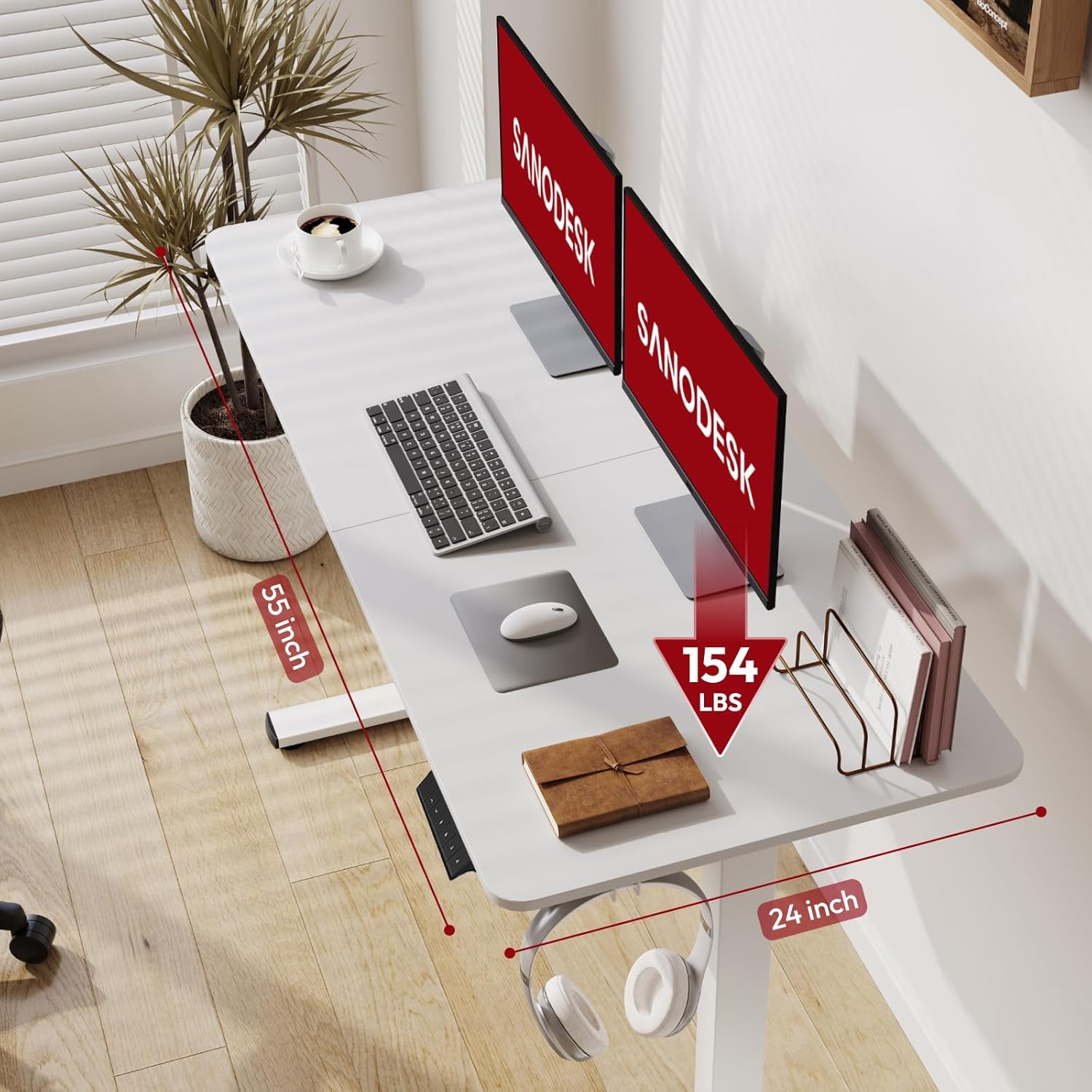 SANODESK Electric Standing Desk 55x24 Inch Height Adjustable Stand Up Desk Home Office Computer Workstation Sit Stand Home Office Desk with Splice Board (White Frame + White Top)