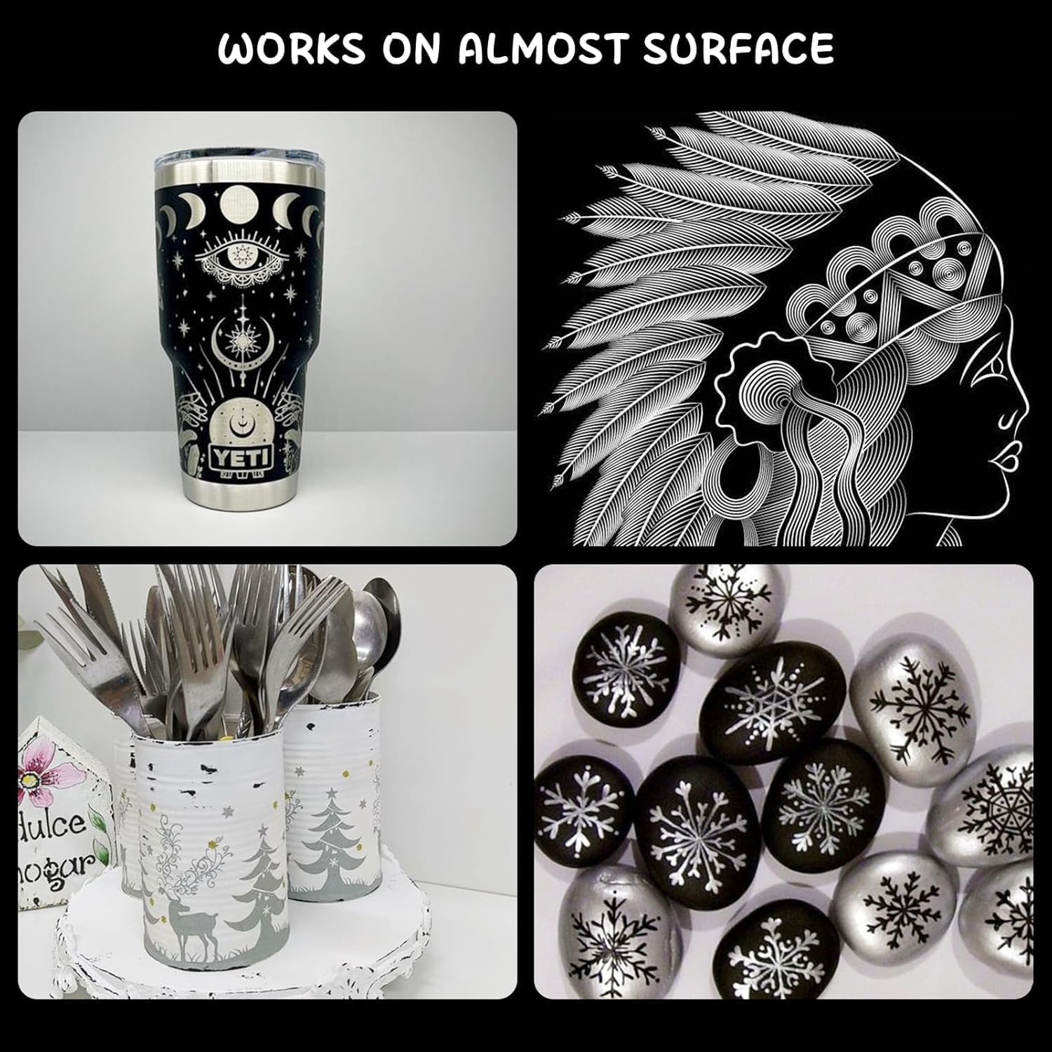 - EXCELLENT COVERAGE ON ALL SURFACES - Our highly pigmented, opaque ink provides strong adhesion and vibrant color payoff on both light and dark backgrounds. Works effortlessly on rock, plastic, ceramic, glass, metal, wood, and canvas.