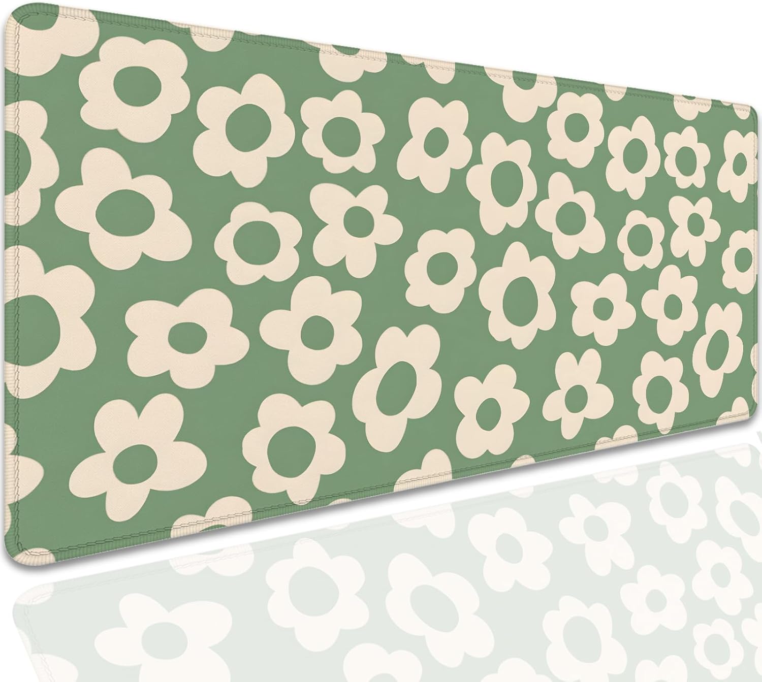 Green Daisy Flowers Desk Pad Mouse Pad,Large Daisies Floral Mouse Mat with Stitched Edges,Non-Slip Rubber Base Mousepad for Office PC Keyboard Laptop and Home Work Desk Mat(27.5X11.8 in)