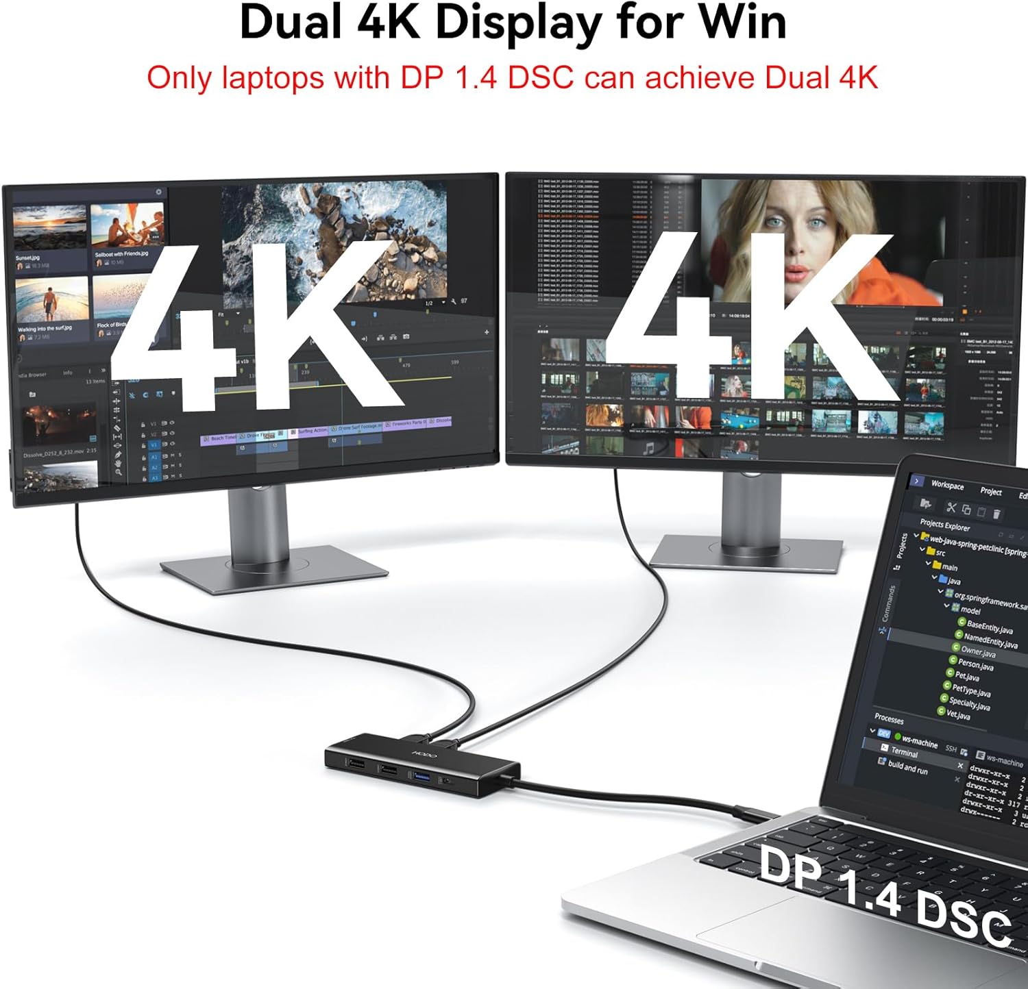 - Laptop Docking Station 4K Display Adapter: The USB C Docking Station Dual HDMI Splitter with 4 video output ports: 2 HDMI+DP+VGA. For single display, HDMI can reach 8K@30HZ or 4K@144HZ; For dual display and triple display, Can output up to 4K Dual/Triple Display videos(For laptop with DP 1.4 DSC); For quadruple display, Dual HDMI, DP, and VGA all are 1080@60Hz. Please make sure your laptop specification support DP1.4 signal output. If the VGA port is connected, it will affect the resolution of all displays up to 1080P only