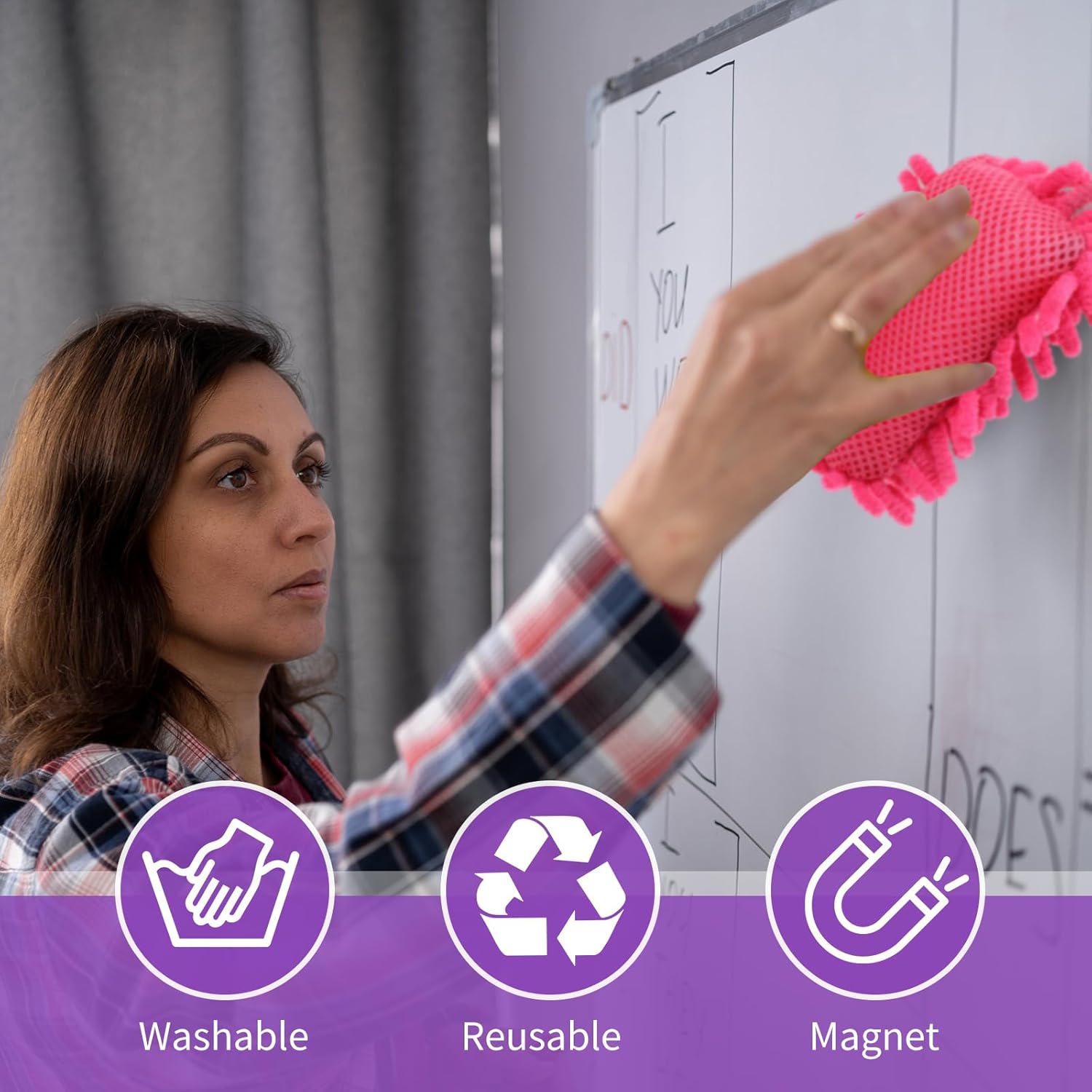 - Magnet Design: unlike other microfiber whiteboard erasers, the magnets are wrapped inside our dry erase erasers, which can be easily attached to the magnetic whiteboard without worrying about losing them. And the magnets are securely wrapped inside the dry erasers, so you don't have to worry about kids swallowing them