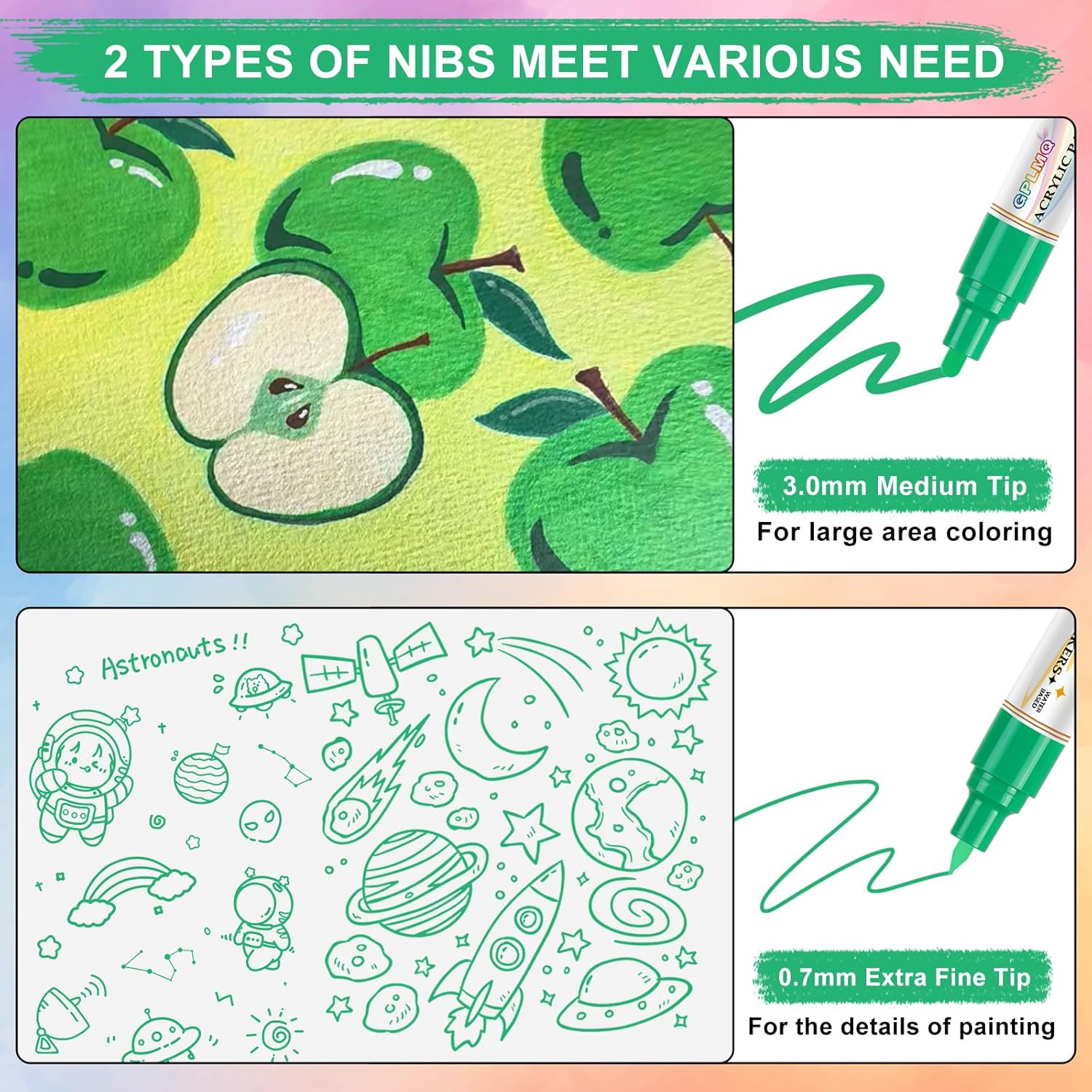 - Dual-Tip Design for Versatility: Each paint pen features a 0.7mm fine tip for detailed lines and a 3mm medium tip for filling larger areas, making it perfect for outlining, lettering, and adding intricate details to your DIY projects