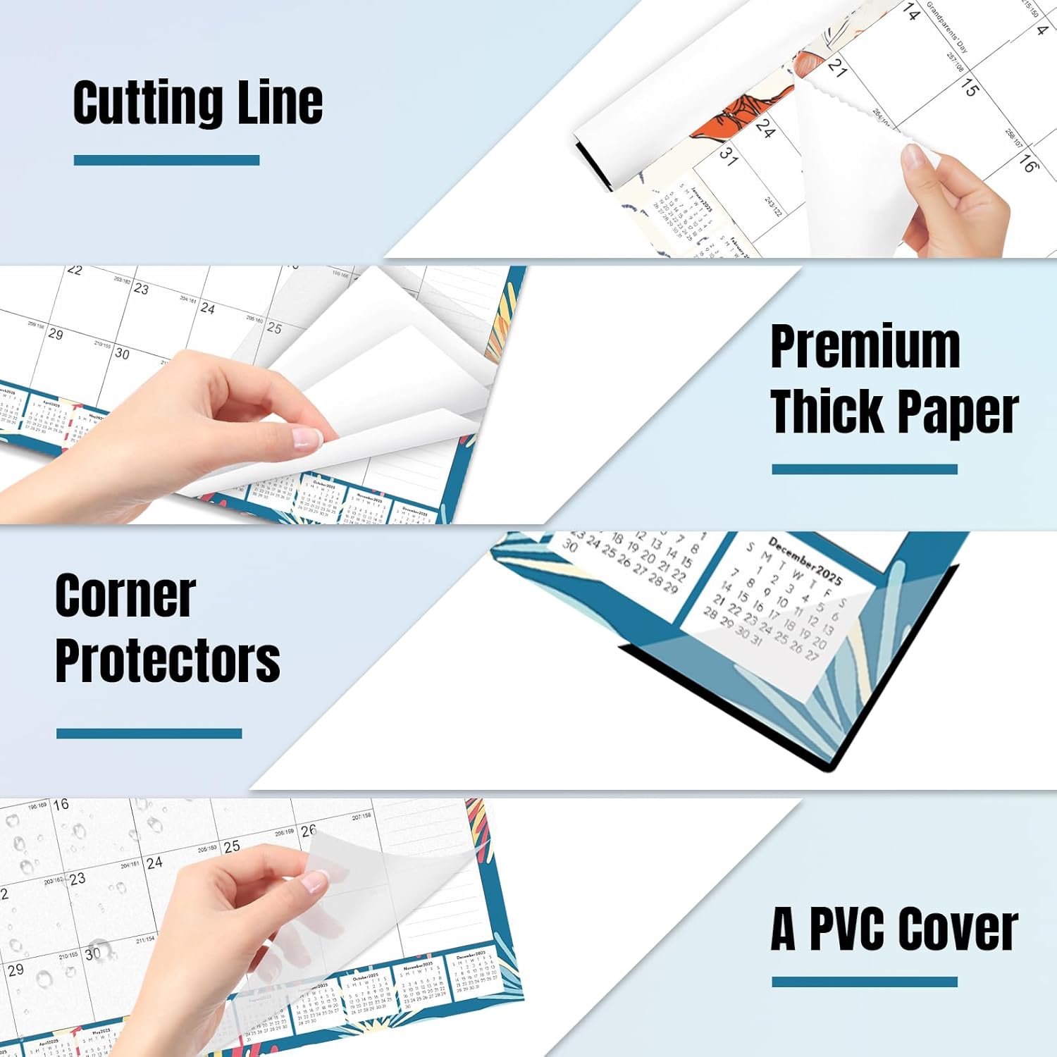 - ✨【Transparent Plastic Cover】Our desk calendar 2025 with clear plastic cover protects the calendar from accidentally tipped coffee or water wetting the papers,Two corner protectors are included to keep the pages flat( tips : Writeable after lifting the cover)