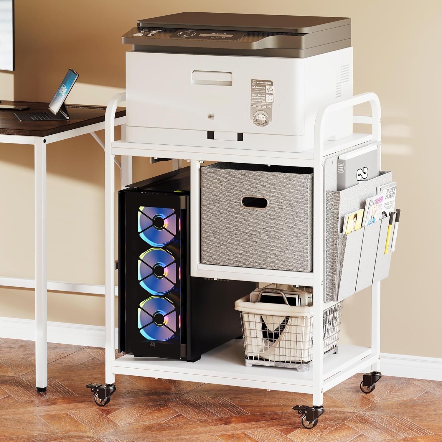 - 𝗣𝗿𝗲𝗺𝗶𝘂𝗺 𝗠𝗮𝘁𝗲𝗿𝗶𝗮𝗹𝘀: Crafted from high-quality steel, durable MDF, and heavy-duty industrial wheels, this printer table with storage is designed for long-lasting durability. Its sturdy construction supports even the heaviest office equipment, offering exceptional stability and reliability for years of use.