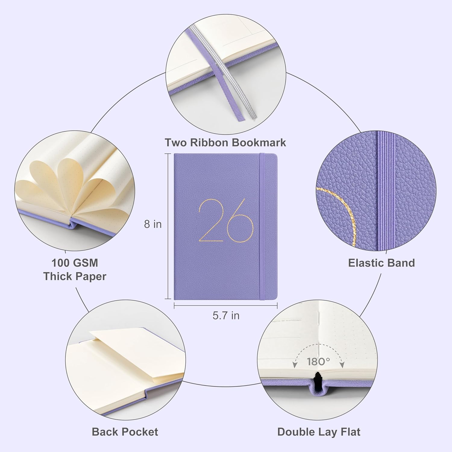 And Per Se 2026 Planner-Daily, Weekly & 15-Monthly Leather Hardcover Planner, 5.7" x 8", Daily Schedule, Monthly Tabs, 100 GSM Thick Paper, Back Pocket(Lavender)
