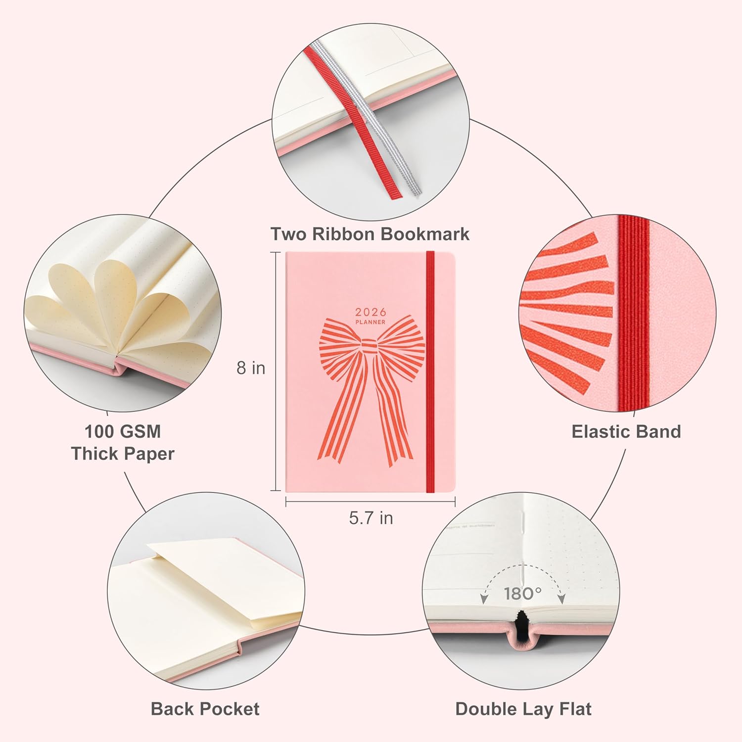 And Per Se 2026 Planner with Pattern-Daily, Weekly & 15-Monthly Leather Hardcover Planner, 5.7" x 8", Daily Schedule, Monthly Tabs, 100 GSM Thick Paper, Back Pocket(Bowknot Pattern)