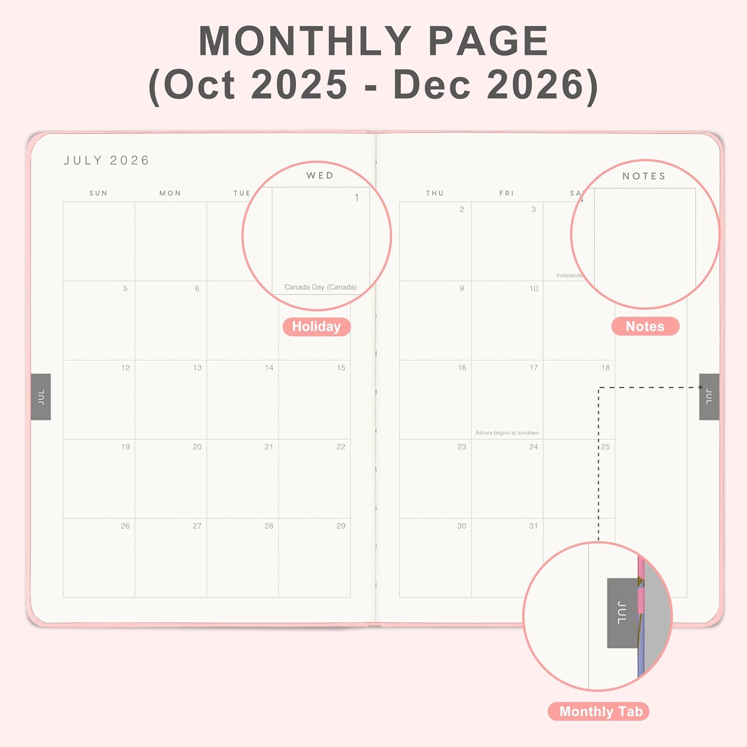 - MONTHLY OVERVIEW:Each date box provides enough writing space, including a display of holidays for each month, and the right notes row is additional planning space. 2 Ribbon bookmarks and month displays for easy navigation and lookup.