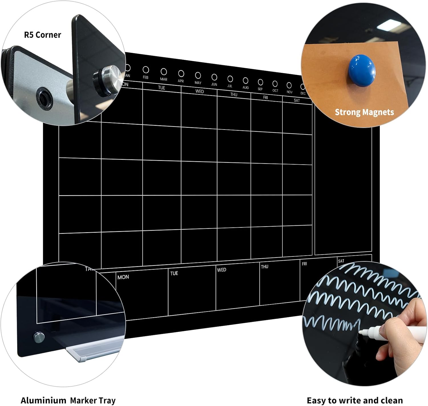 Magnetic Glass Whiteboard 36X24 Monthly Planner Calendar Dry Erase Board for Home, School, Office, Frameless, with Markers, Marker Tray, Eraser, Magnets (Black)