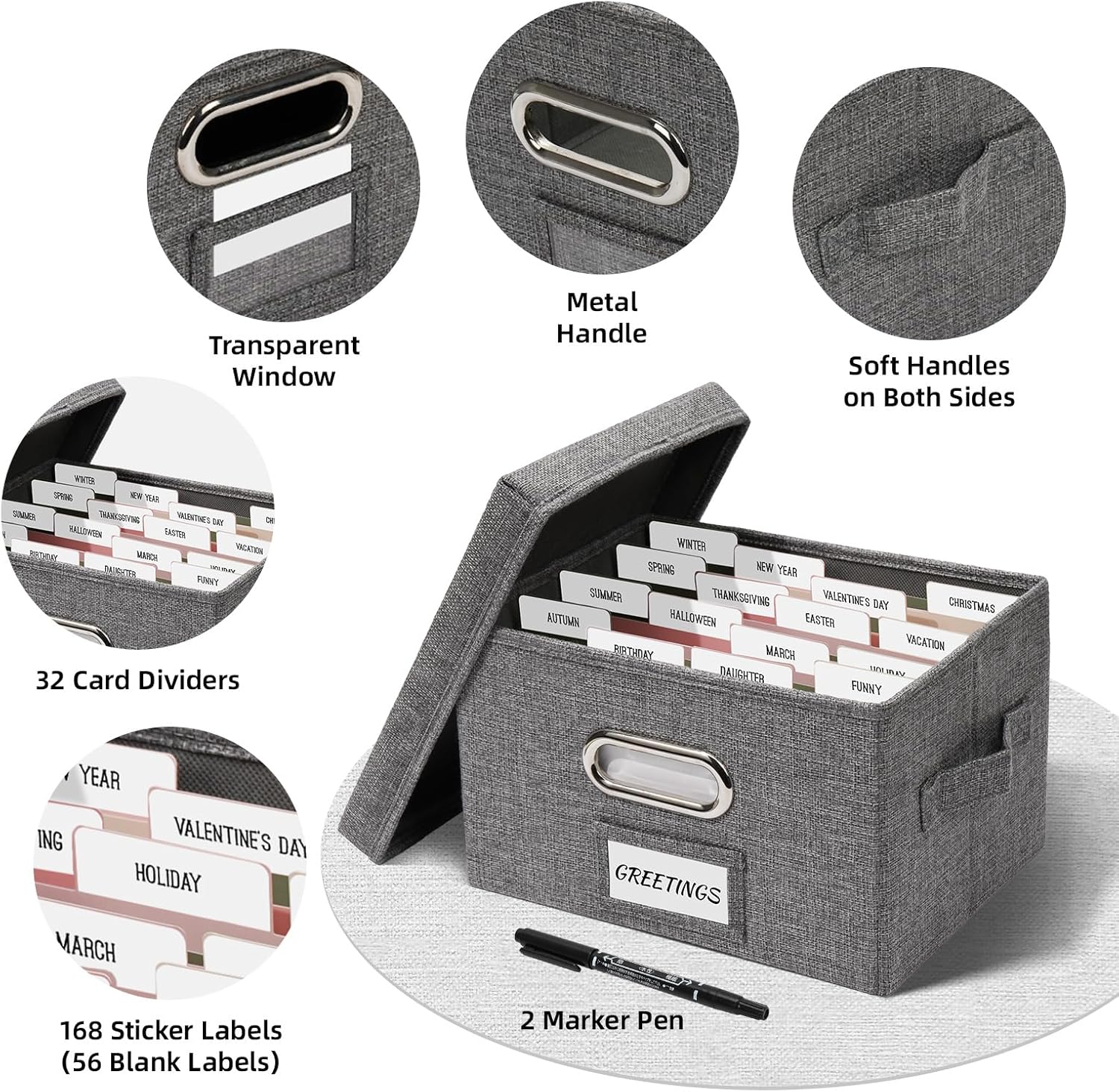 Greeting Card Storage Box, Linen Storage Box with 32 Adjustable Dividers, 168 Labels, 2 Marker Pen, Perfect for Organizing Greeting Cards, Envelopes, Photos 2 Pack Grey