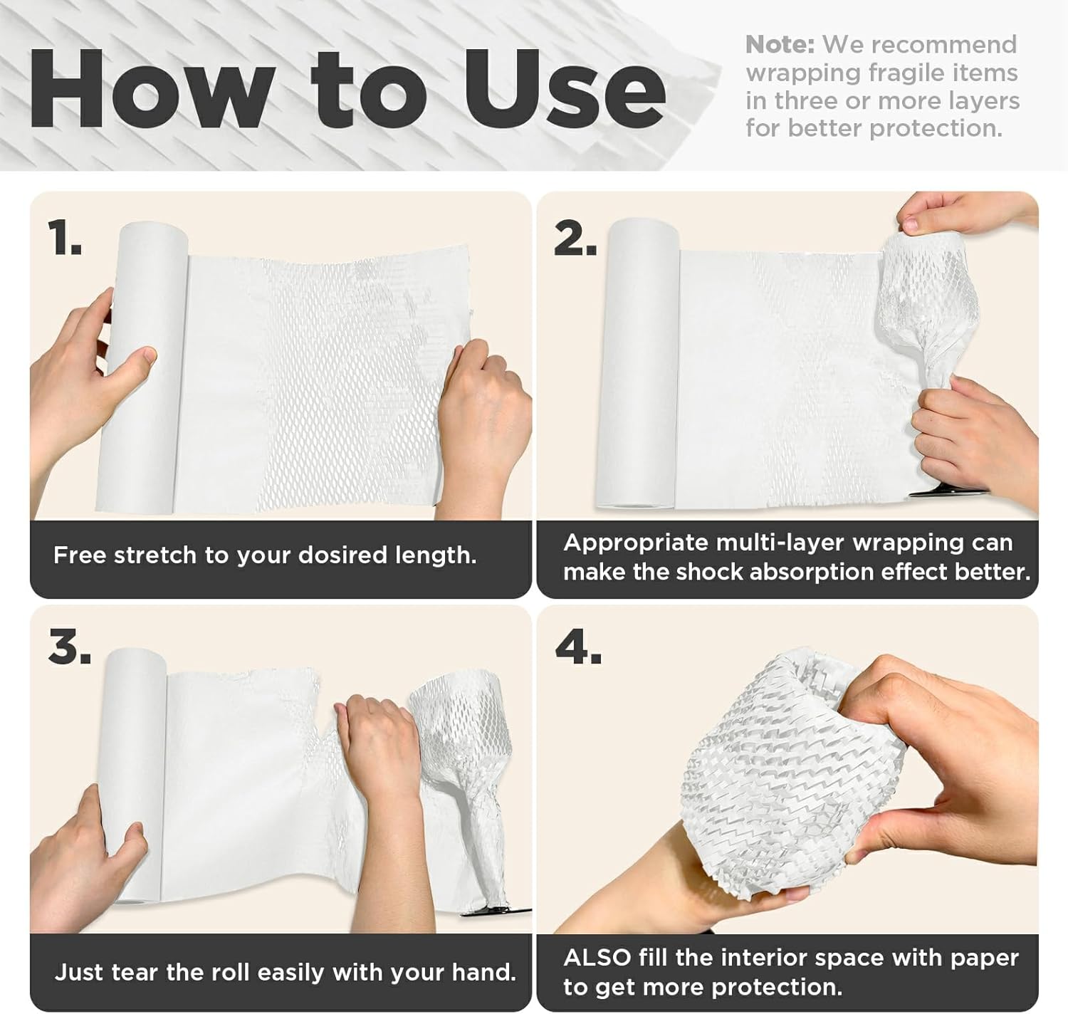 - ♻️Easy To Use -- thanks to its perforated honeycomb design. Just tear it off as you need without any tools, and stretch it to wrap and protect breakables, thus improving packaging efficiency. It's an ideal solution for better cushioning, is shockproof and is anti-scratch. For heavier items, we recommend using it together with bubble wrap for even better cushioning.