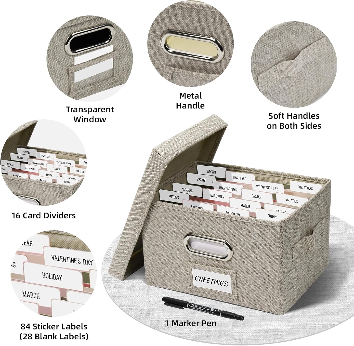 Greeting Card Storage Box, Linen Storage Box with 16 Adjustable Dividers, 84 Labels, 1 Marker Pen, Perfect for Organizing Greeting Cards, Envelopes, Photos 1 Pack Beige