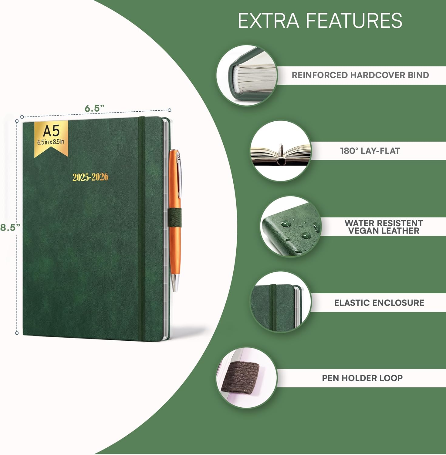 Ensight 2025-2026 HARDCOVER Leather Planner Weekly & Monthly - 6.5x8.5 Inches - Academic Planner Business Personal or Student - Pen Holder, Thick Paper, July 2025 - June 2026 (Green)