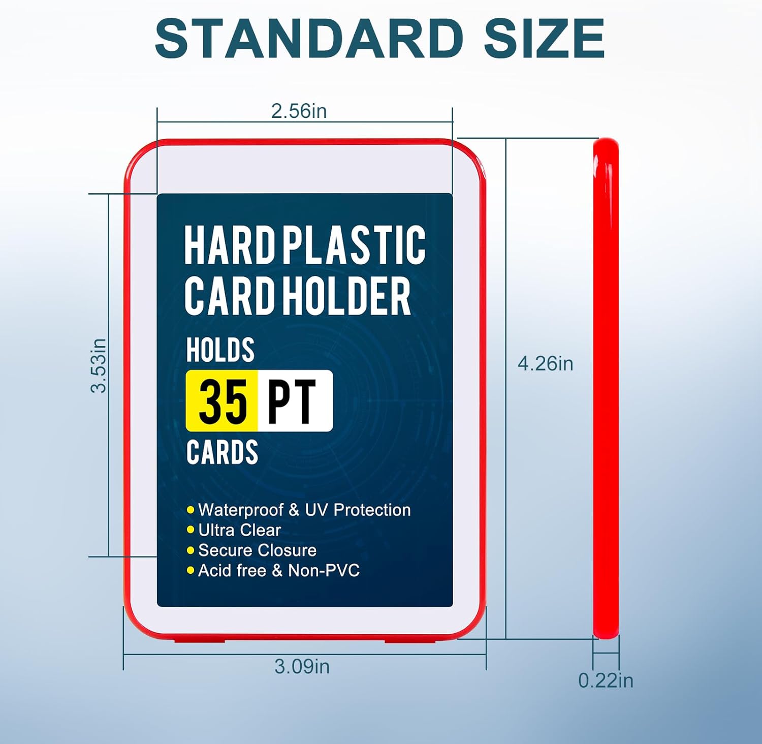 - SUIT FOR STANDARD CARDS: Our plastic card case fits all standard size trading cards such as baseball, sports, and MTG cards. Inner dimension - 3.53 × 2.56 inches, outer dimension - 4.26 × 3.09 × 0.22 inches, the thickness is 35pt.