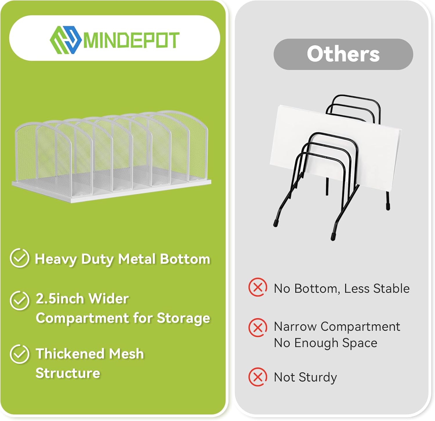 - 7 Section Design with Wide Spacing: This MINDEPOT Desk File Organizer features 7 spacious sections, each with a 2.5-inch gap between, providing ample room for organizing files, books, mails, and more. Compared to other 5-section one, it offers two additional sections and larger spacing for better organization