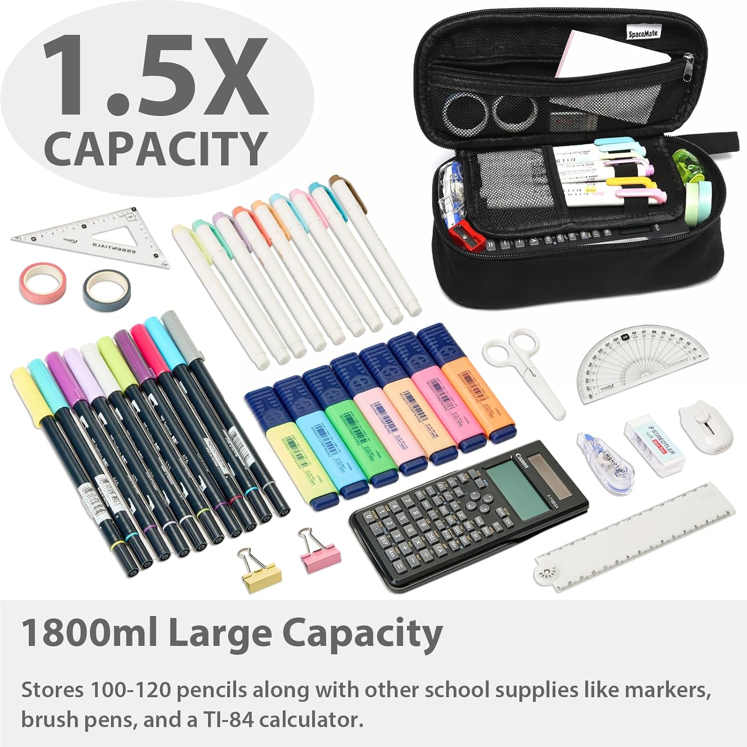 - 1.5X Large Capacity - SPACEMATE pouches have a capacity of 1800ml, is 1.5 times more than others (1000ml). It is easy to store 50-100 pencil, and also can store many kinds of school supplies, such as markers, brush pen, ruler, small notebooks, charger and TI-84 calculator.