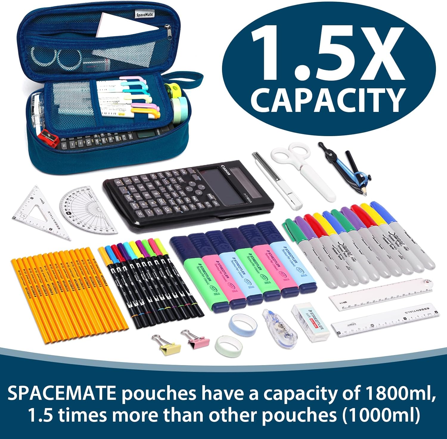- 1.5X Large Capacity - SPACEMATE pouches have a capacity of 1800ml, is 1.5 times more than others (1000ml). It is easy to store 50-100 pencil, and also can store many kinds of school supplies, such as markers, brush pen, ruler, small notebooks, charger and TI-84 calculator.